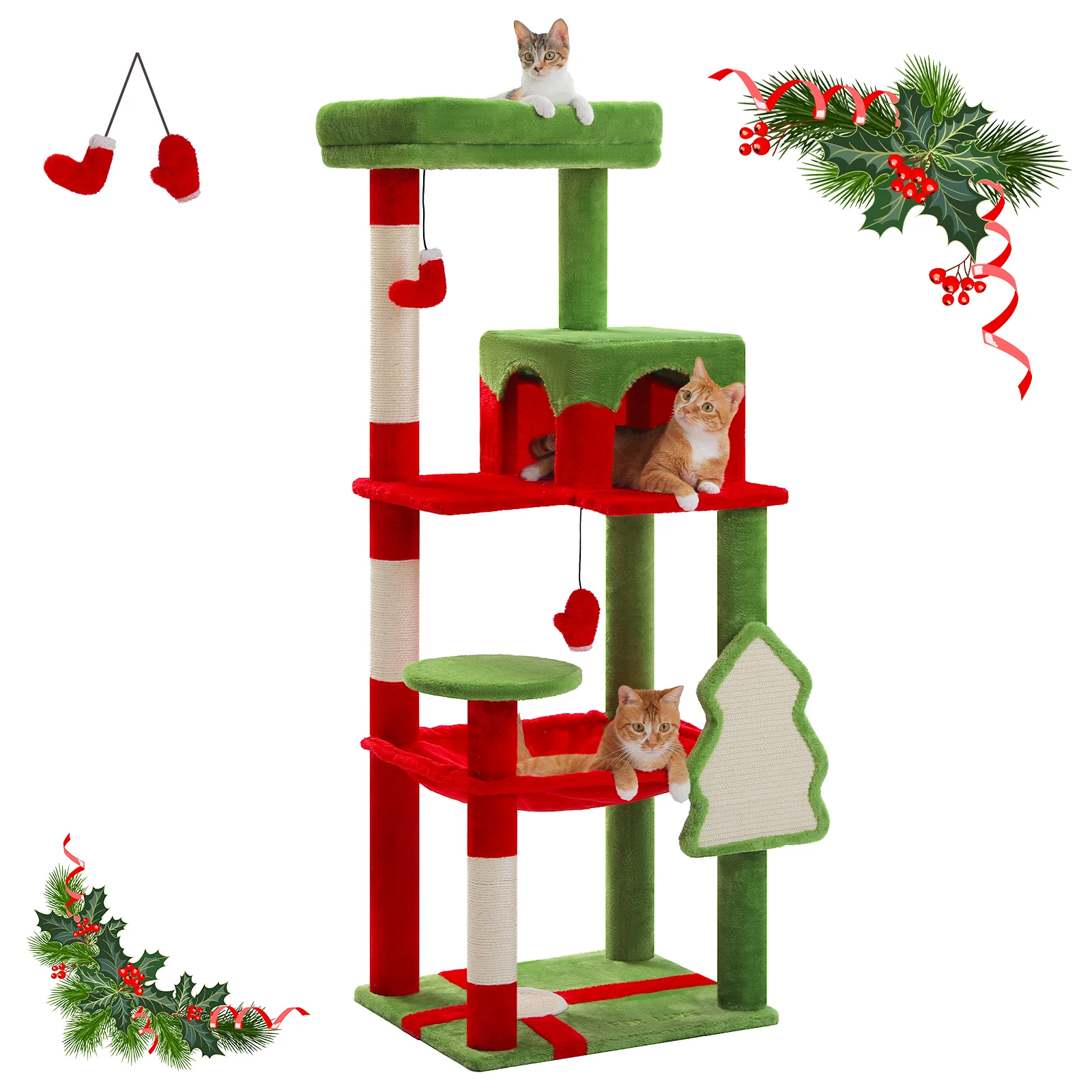 • Parque infantil interior multifuncional:Con una acogedora hamaca grande (51 cm × 41 cm), una espaciosa percha superior (30 cm × 45 cm), 3 postes para rascar, una almohadilla para rascar extraíble, 3 pompones colgantes y un condominio para gatos.Esta torre navideña para gatos satisface todas las necesidades instintiva de tu amigo peludo en un diseño festivo.