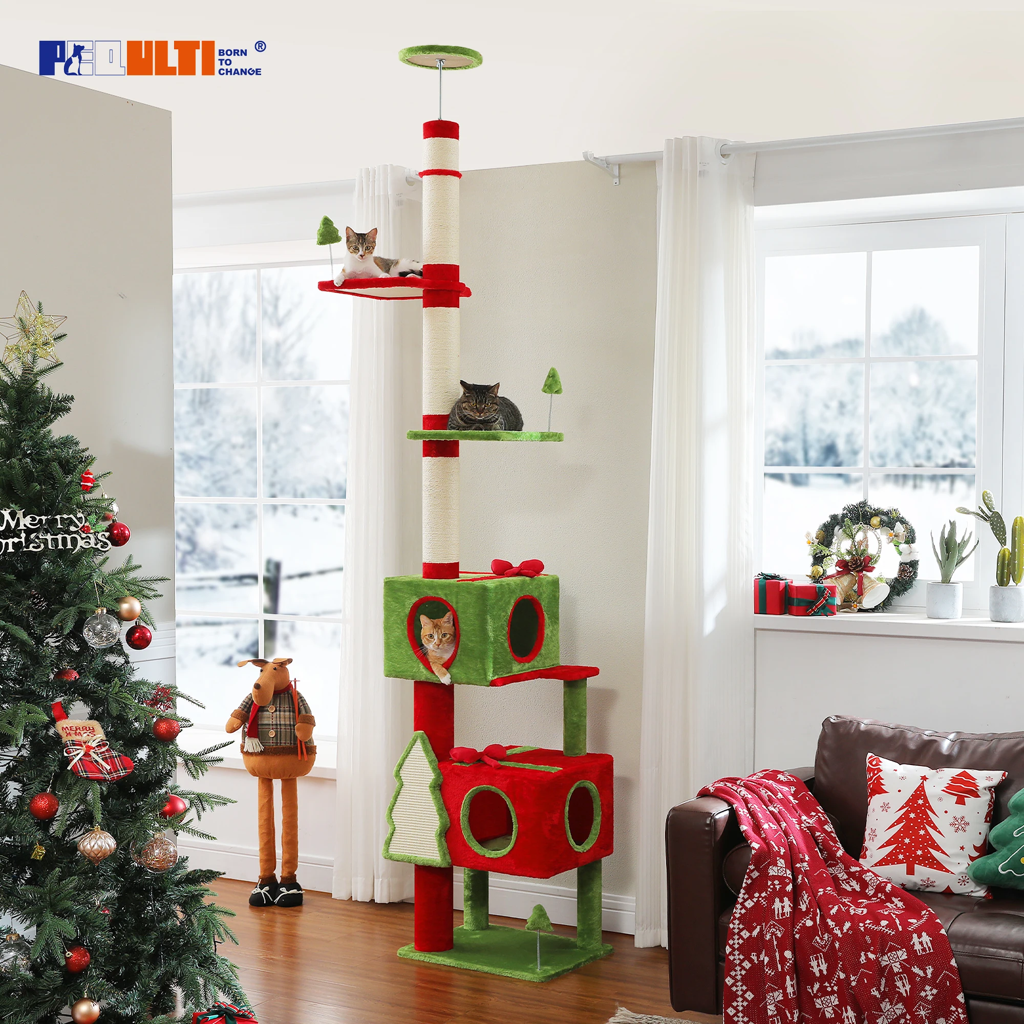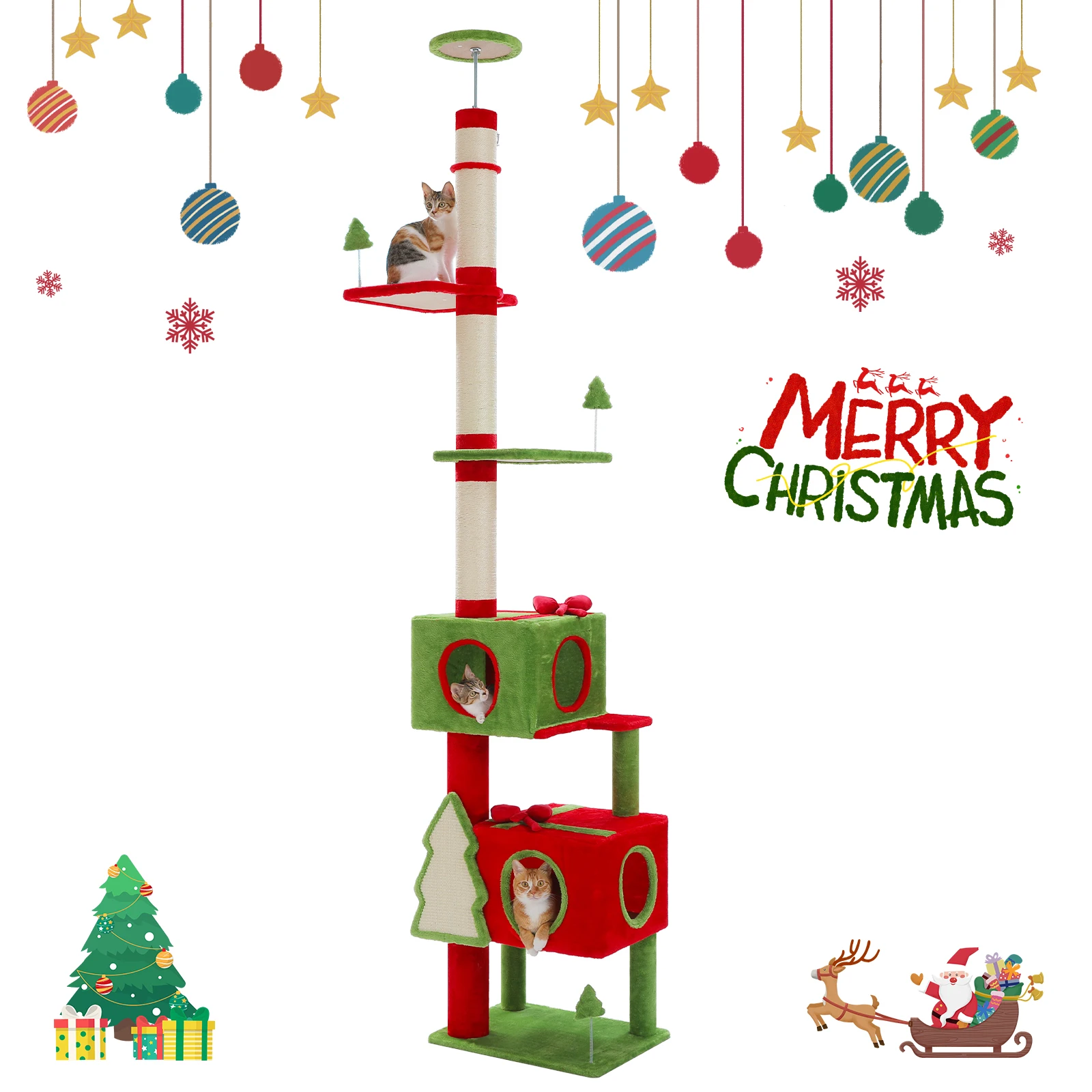 Nombre: Árbol de gatos de Navidad con torre alta para gatos del piso al techo de 231-274 cmcon condones rojos y verdes