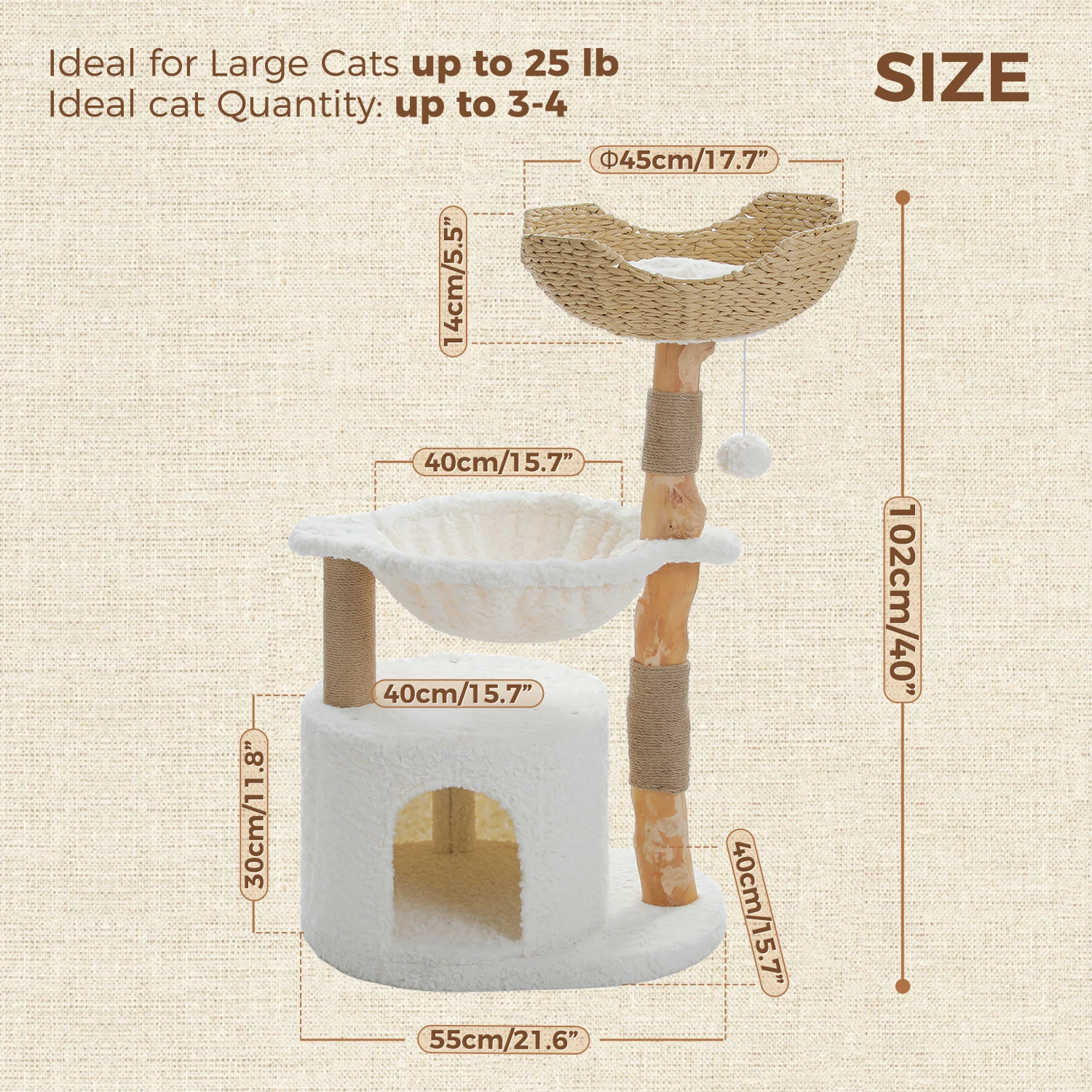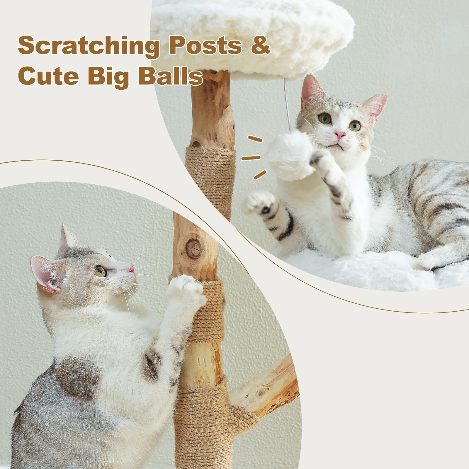 Comodidad de felpa para gatos grandes:La torre para gatos incluye un gran condominio en la parte inferior, recubierto de suave pelaje blanco, lo que proporciona un espacio confortable para los gatos.La hamaca superior y profunda se adapta perfectamente a la curva del cuerpo del gato, ofreciendo una sensación de seguridad similar a estar en tus brazos.Esta casa para gatos satisface diversas necesidades de descanso, lo que la hace ideal para hogares de gatos múltiples y grandes.