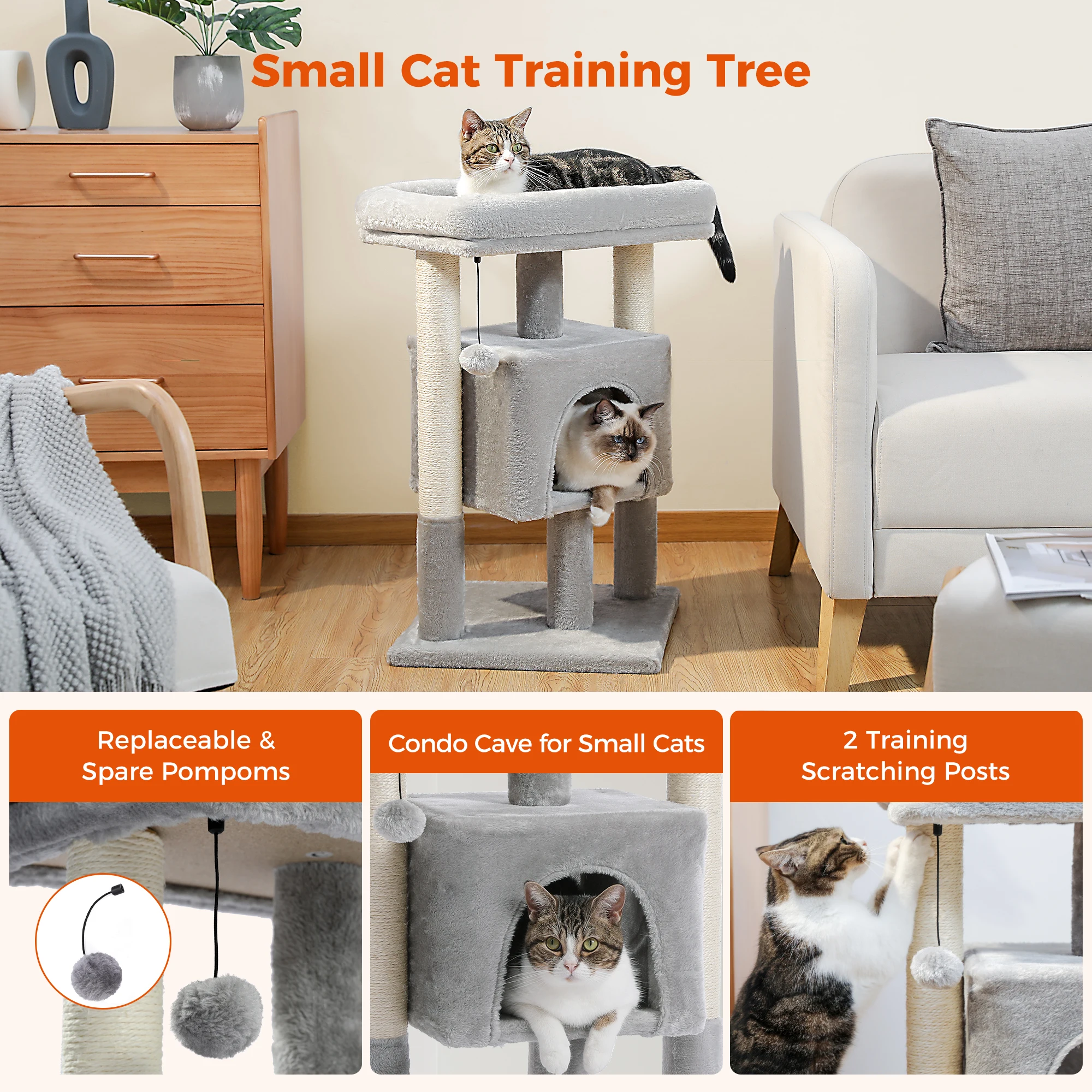 Torre pequeña de árbol para gatos con postes rascadores de sisal Natural, percha superior suave y pompón de felpa, cómodos condos para gatos para juguetes para gatos de interior
