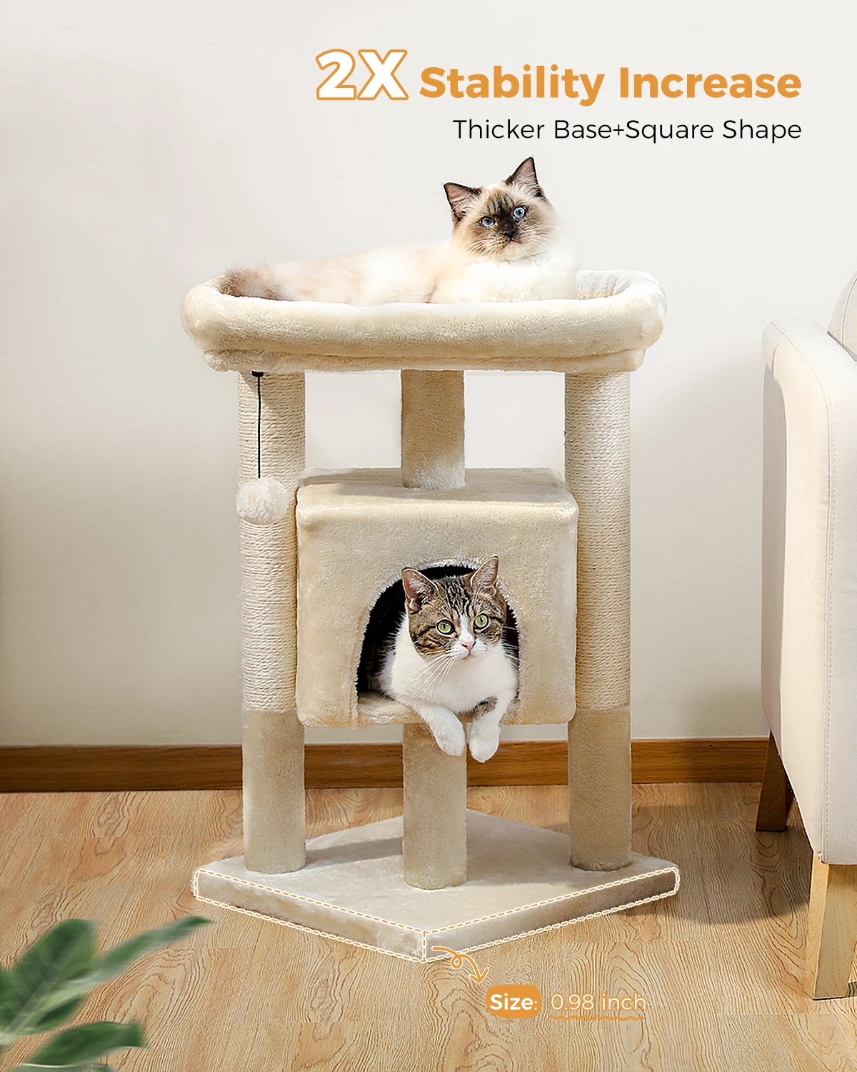SEGURO Y ESTABLE:La placa base reforzada y el diseño bien equilibrado garantizan que sus gatos puedan saltar o quitar de forma fácil y segura este árbol para gatos pequeño pero resistente.