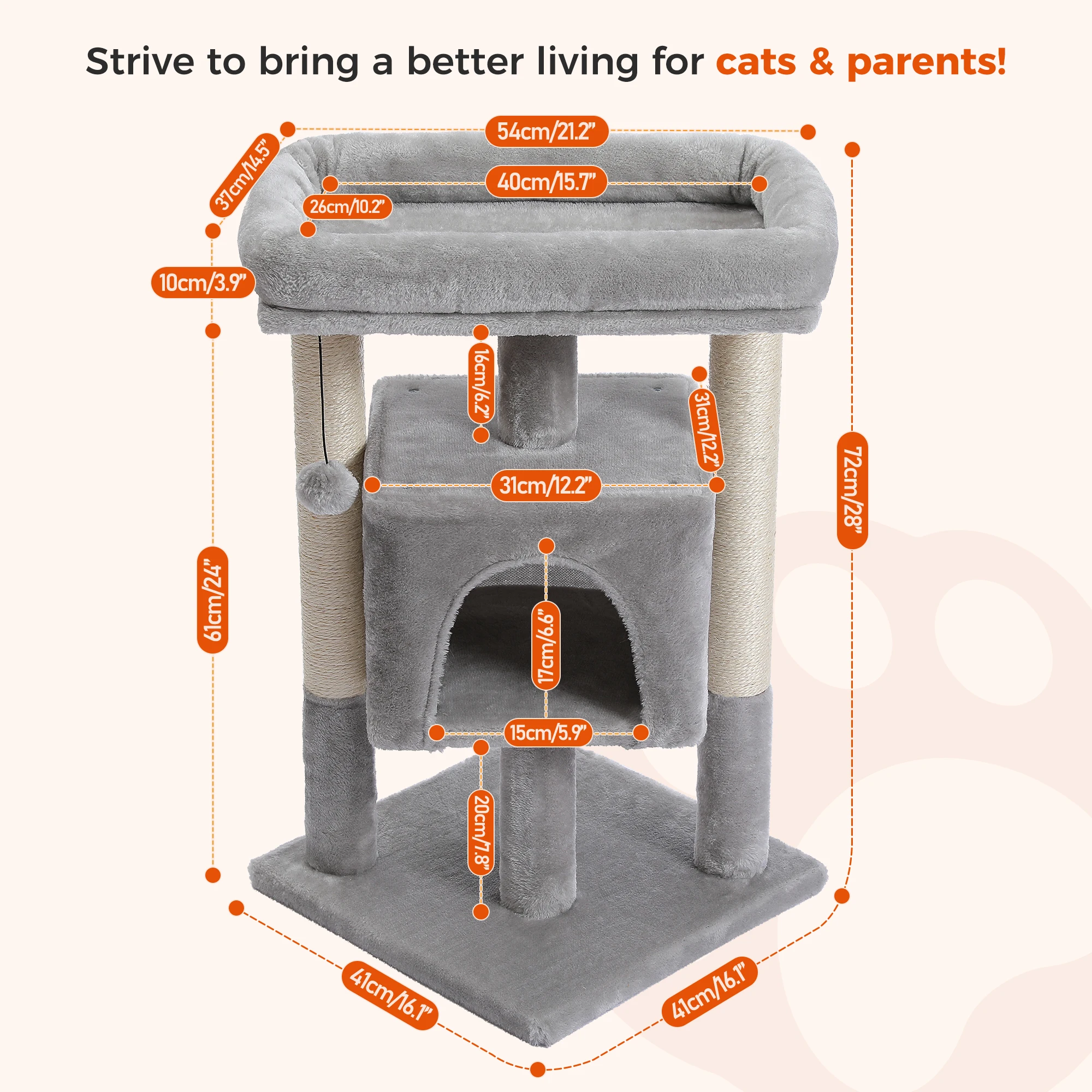 CALIDAD SUPERIOR:Compuestos por tablero de alta calidad y tela de felpa, el condominio y las perchas son muy suaves y cómodos, a los miembros peludos de tu familia les encantará el toque lujoso y disfrutarán explorando y olfatando por su nueva casa.Los postes rascadores reforzados están cubiertos por una cuerda de sisal natural: un tipo de material saludable que a tus gatos les encantará porque se siente mucho como rascarse la corteza de los árboles.