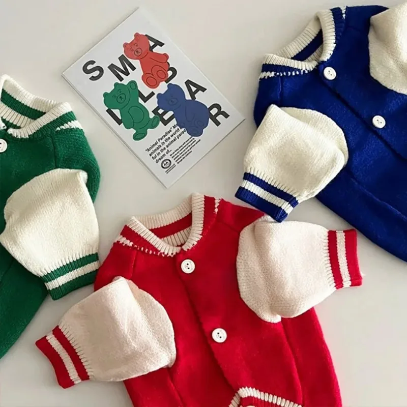 Traje de béisbol informal para mascotas, suéter de peluche cálido tejido para perros, ropa para perros con Bordado de letras, camisa Popular con botones abiertos
