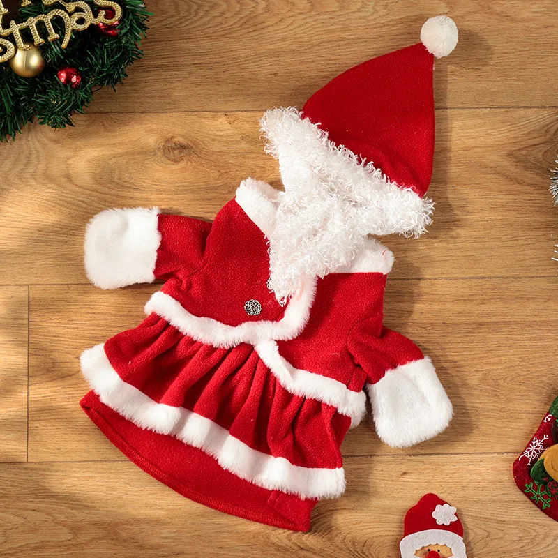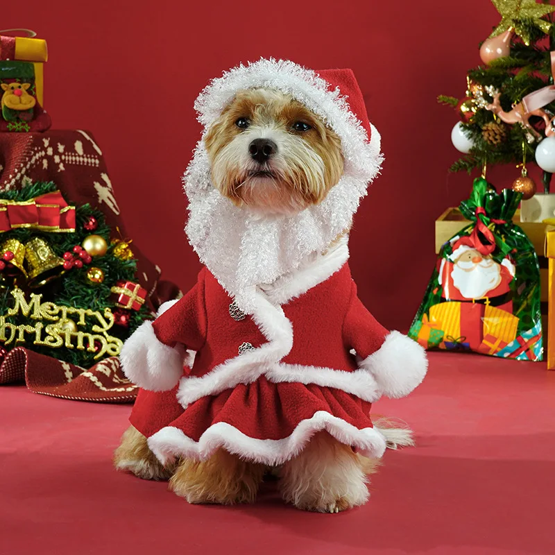 Traje cálido para mascotas para perros pequeños/medianos, disfraz navideño para perros de Papá Noel con sombrero, vestido polar con borde de felpa,