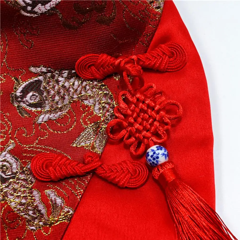 Con la característica del diseño de bloque de color de dos colores y el patrón de carpa único que significa buena suerte, buena suerte, salud, felicidad, esta capa para mascotas hará que su mascota sea más encantadora, festivo y llamativo. Y el diseño de borla de nudo chino con cuentas de porcelana azul y blanca agrega un ambiente más festivo a su mascota.