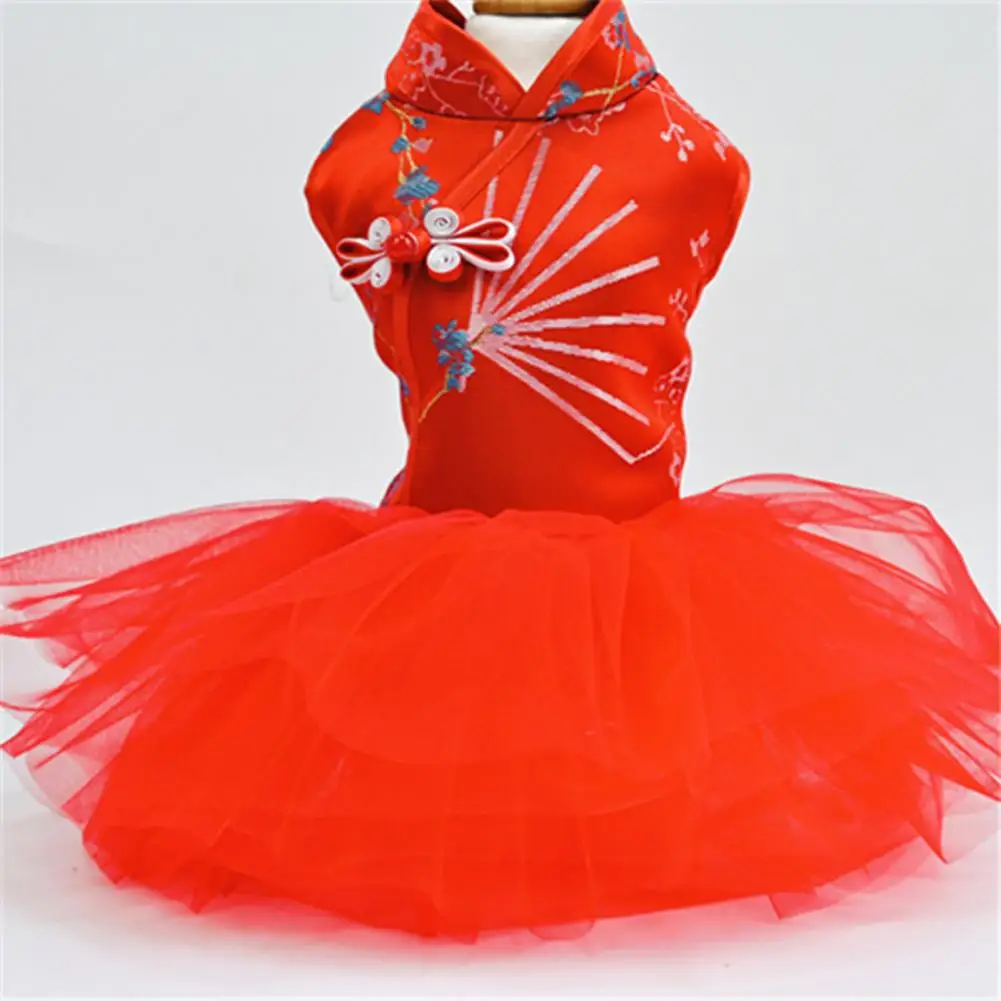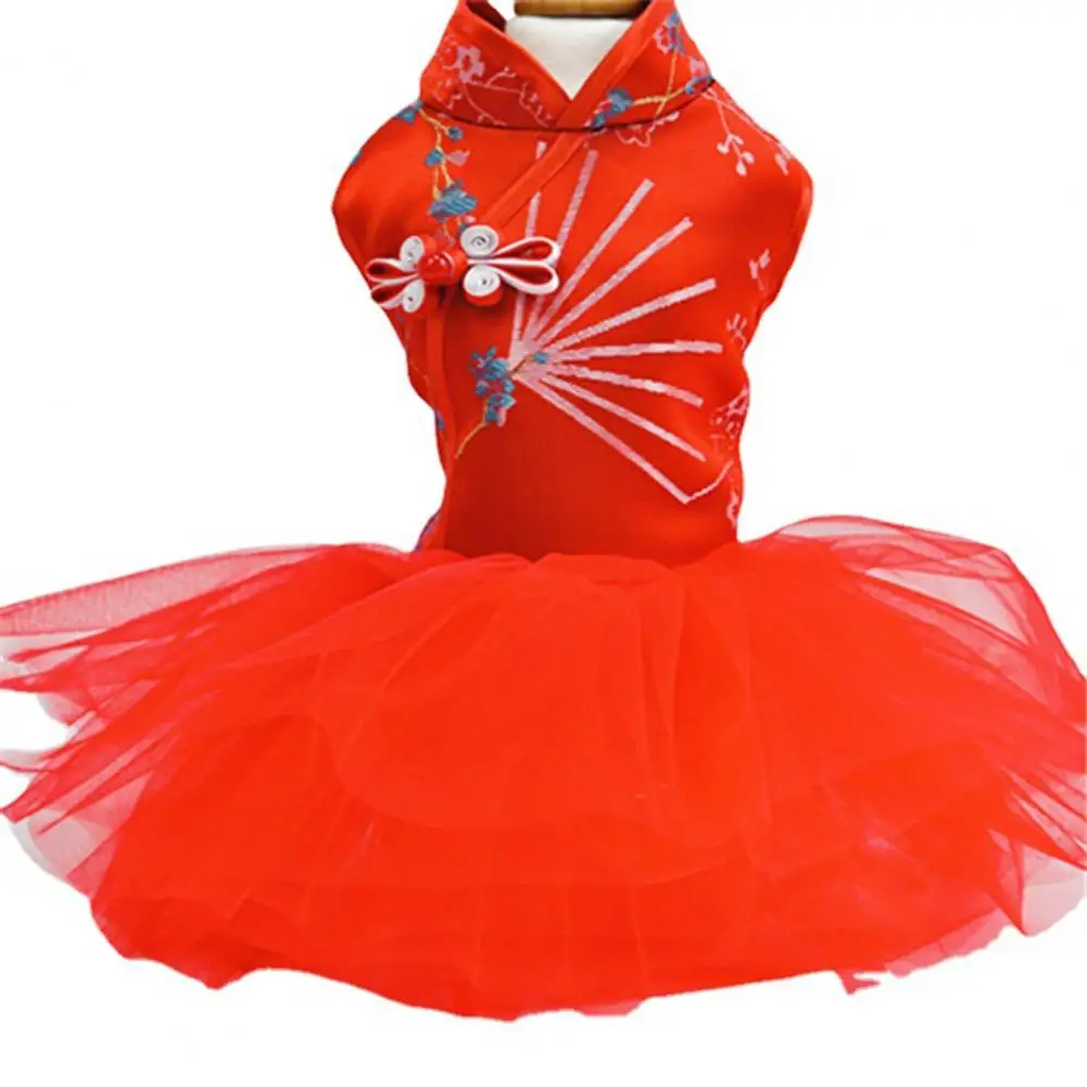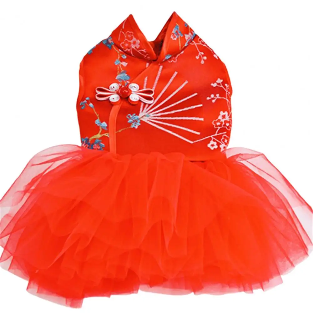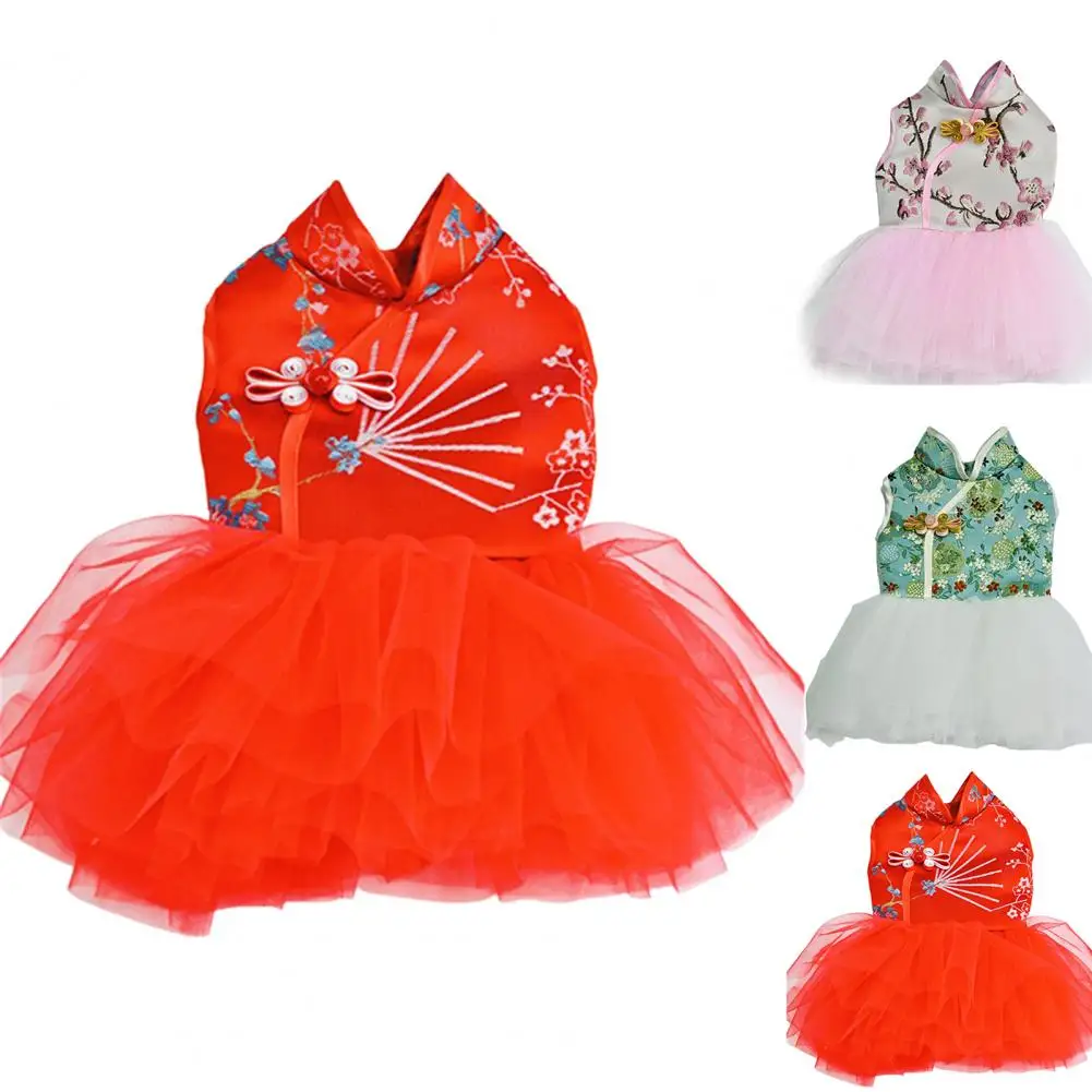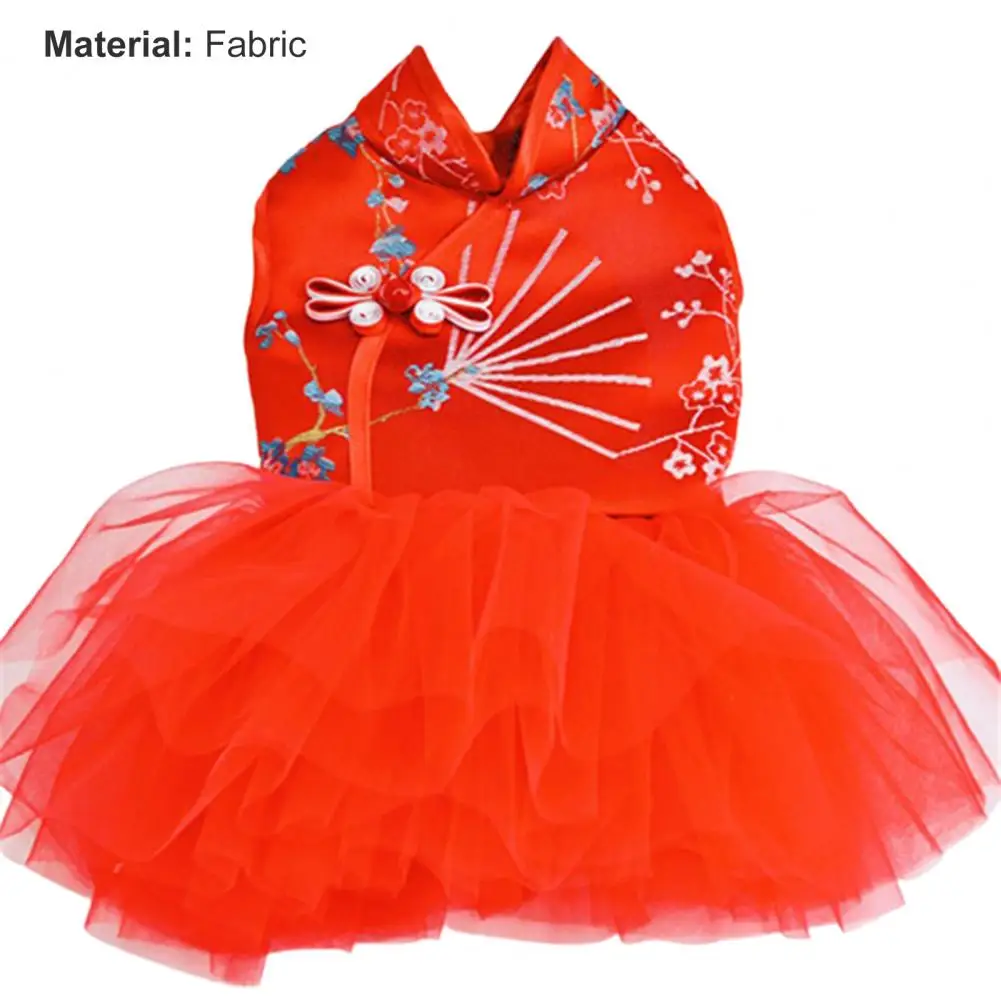 Traje Tang para mascotas Vestido de estilo chino Perros de compañía amigables con la piel Vestido de tul Cheongsam para Año Nuevo