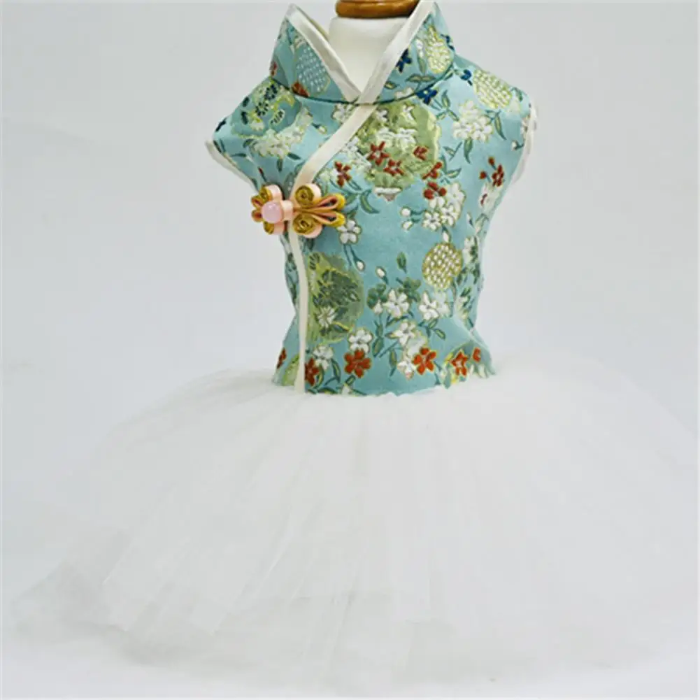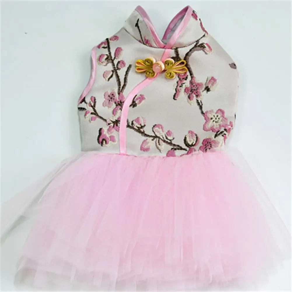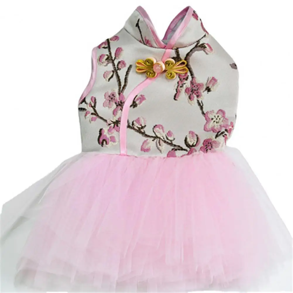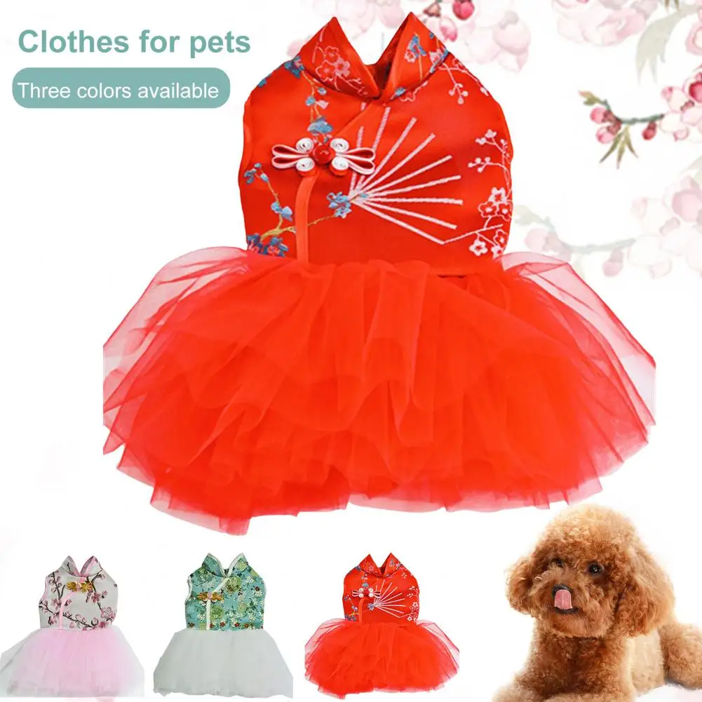 Traje Tang para mascotas Vestido de estilo chino Perros de compañía amigables con la piel Vestido de tul Cheongsam para Año Nuevo