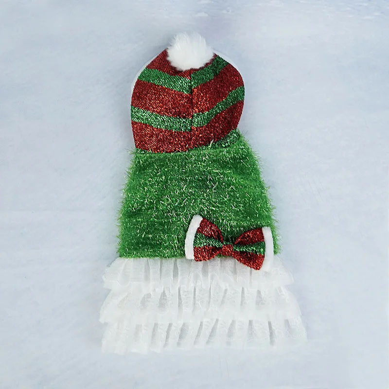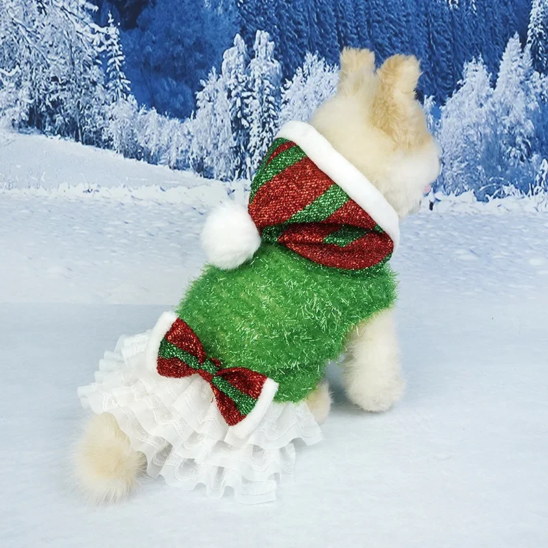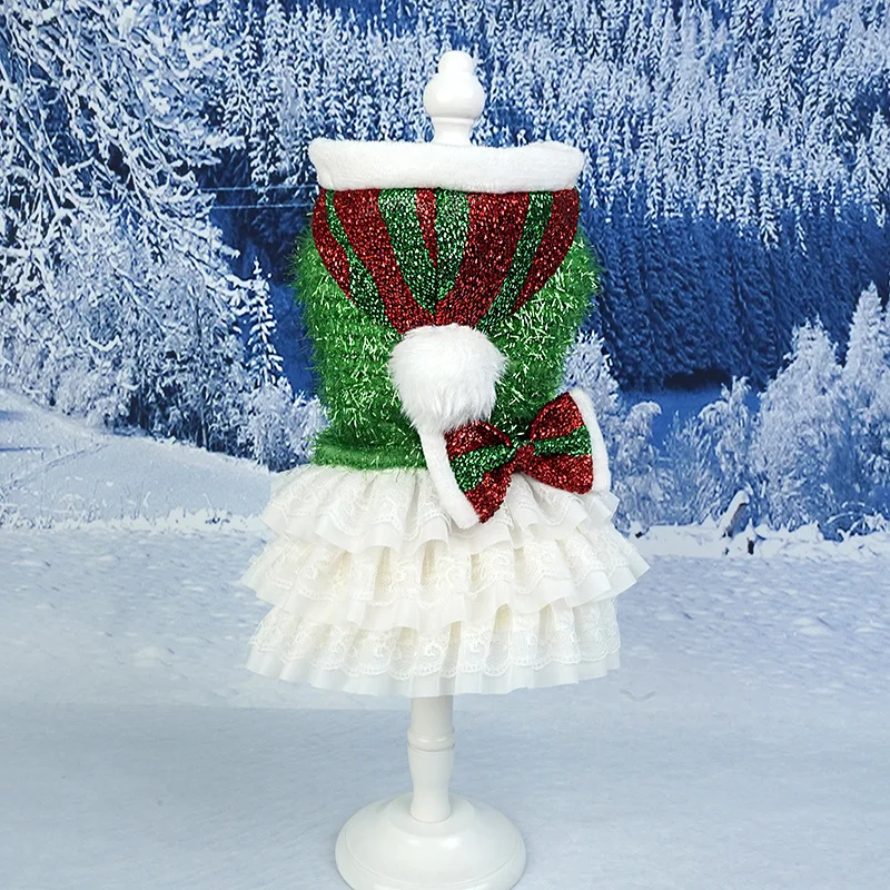 Traje de vacaciones para perros pequeños y medianos, vestido navideño para perros, diseño de rayas brillantes con lazo y pompón, ropa festiva con pompones para