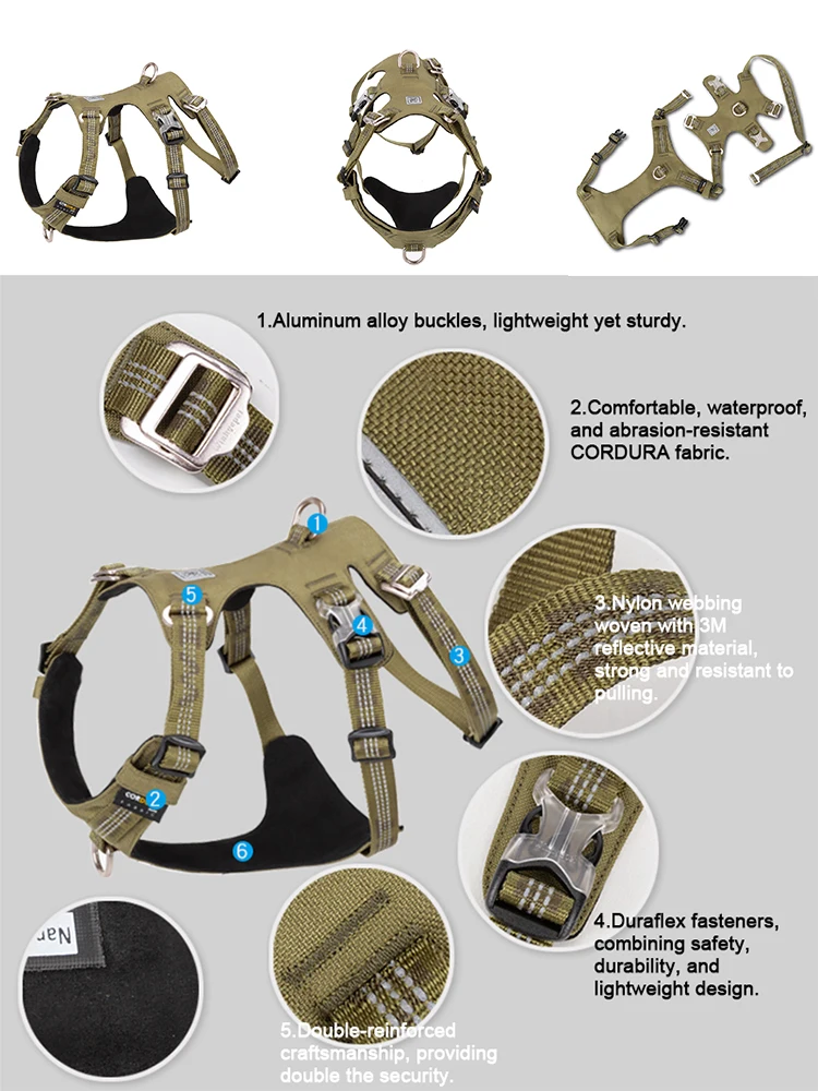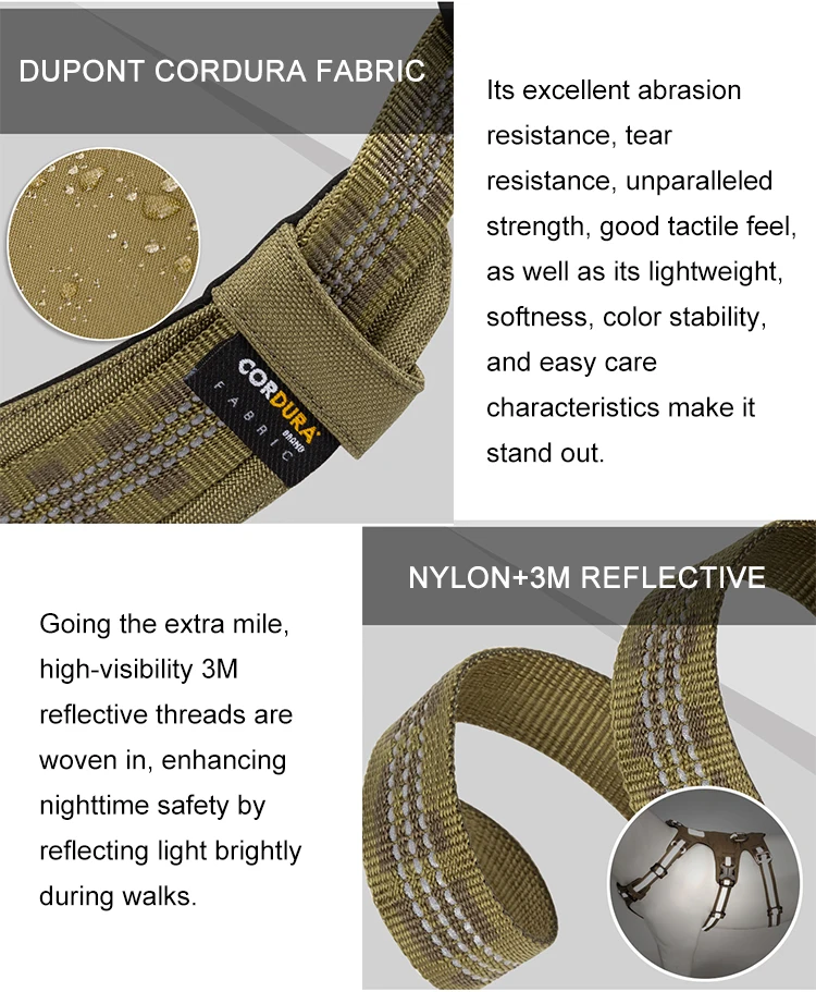 1. Elaborado con material CORDURA resistente, diseñado para resistir el desgaste, mientras que la microfibra transpirable garantiza comodidad para su mascota.La característica resistente al agua añade protección adicional contra los elementos.