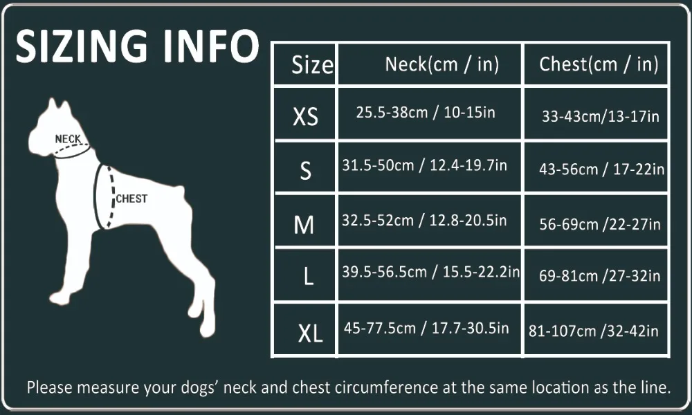 Nota: la talla en la tabla es la talla del perro.Debido a los diferentes métodos de medición, el tamaño puede tener un error de 2 a 3 cm.