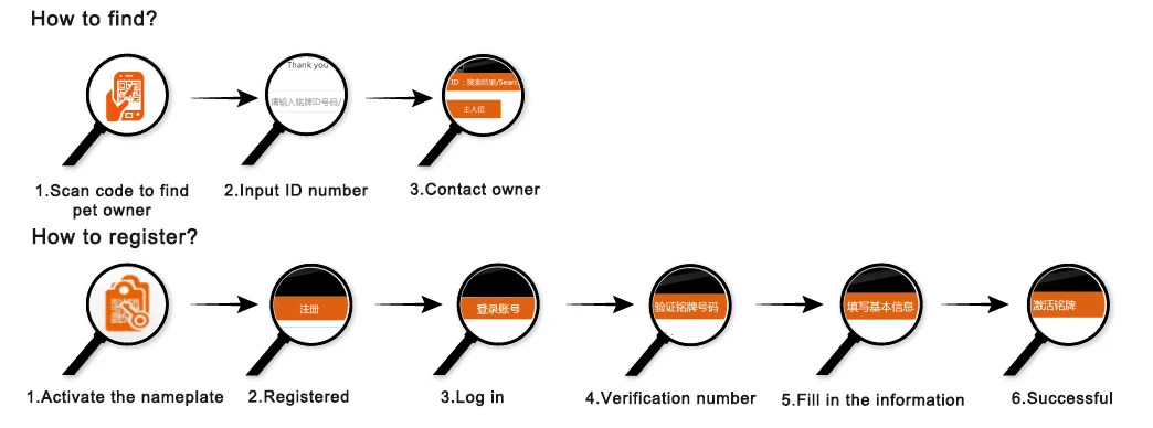 Función con código QR que le permite registrar a su mascota y ayuda a encontrar la mascota perdida para localizar y contactar al propietario.