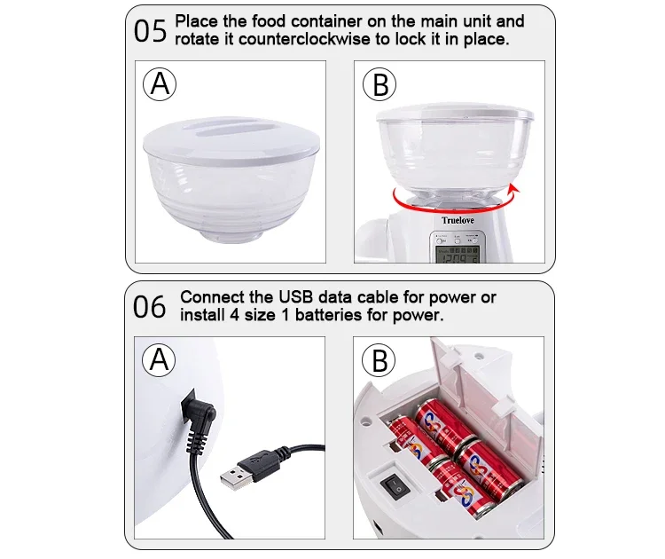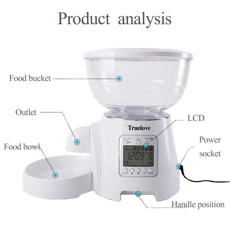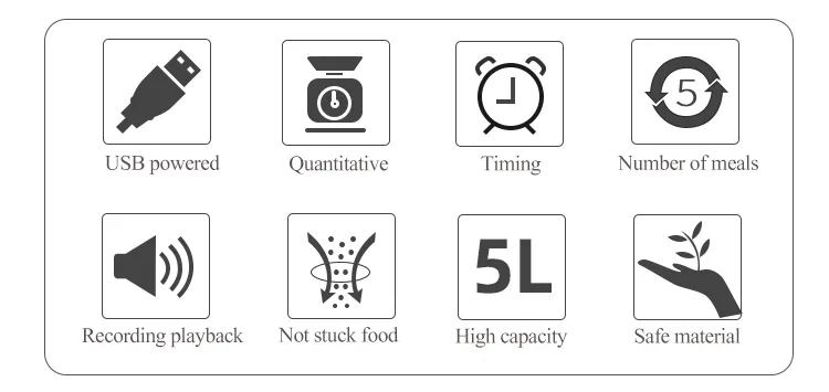 3. 【Función de grabación de voz】--El dispositivo viene equipado con una función de grabación de voz.Puede grabar un mensaje que se reproducirá durante la alimentación.Esto puede ayudar a sus mascotas a asociar la voz grabada a la hora de comer.
