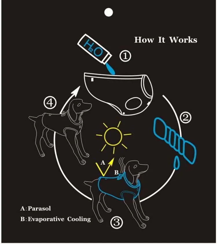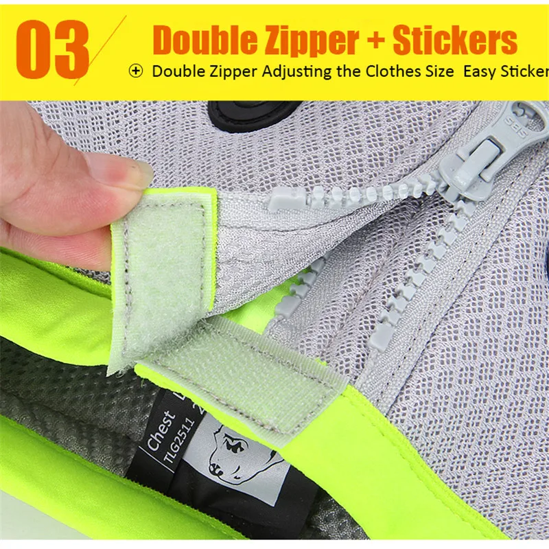 Material: malla con forro de algodón absorbente, reflectante 3M, cremallera SBS, anillo en D de aleación de aluminio, inmersión en agua fría-escurrir en seco-Enfriar