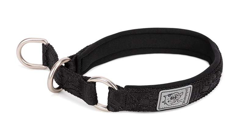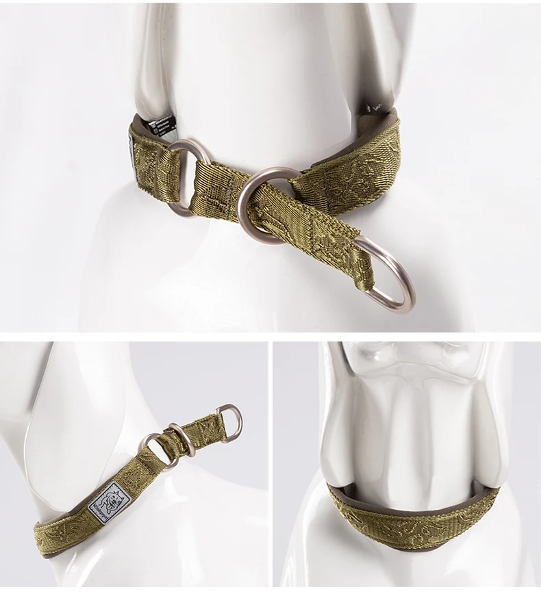 Collar sólido, de buena calidad y bonito. En reposo, el collar está suelto. Con el perro en la correa, el collar se estira alrededor del cuello pero sin apretar. Eso es perfecto. Gracias.
