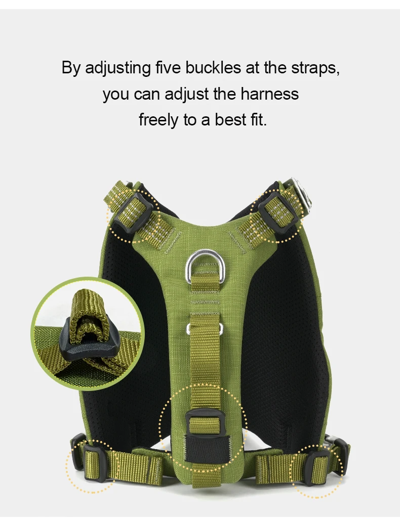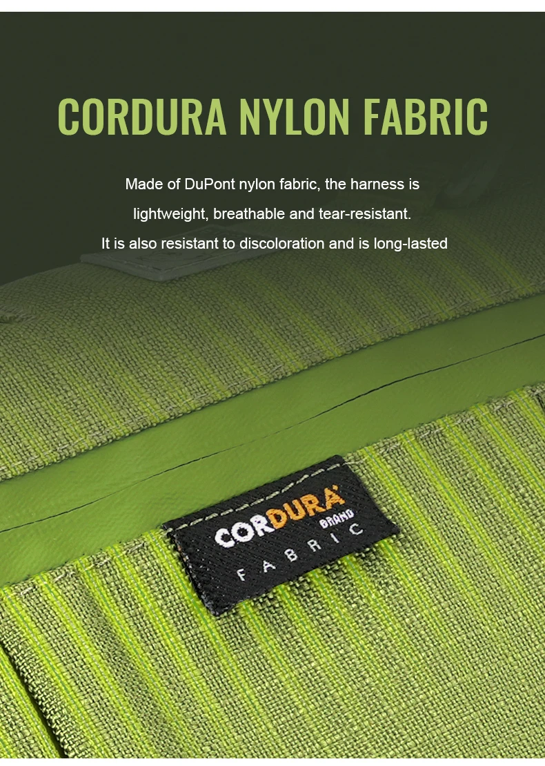 1. Hecho de tela de nailon DuPont, el arnés es ligero, transpirable y resistente al desgarro. También resiste la decoloración y es duradero.