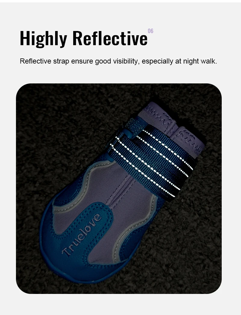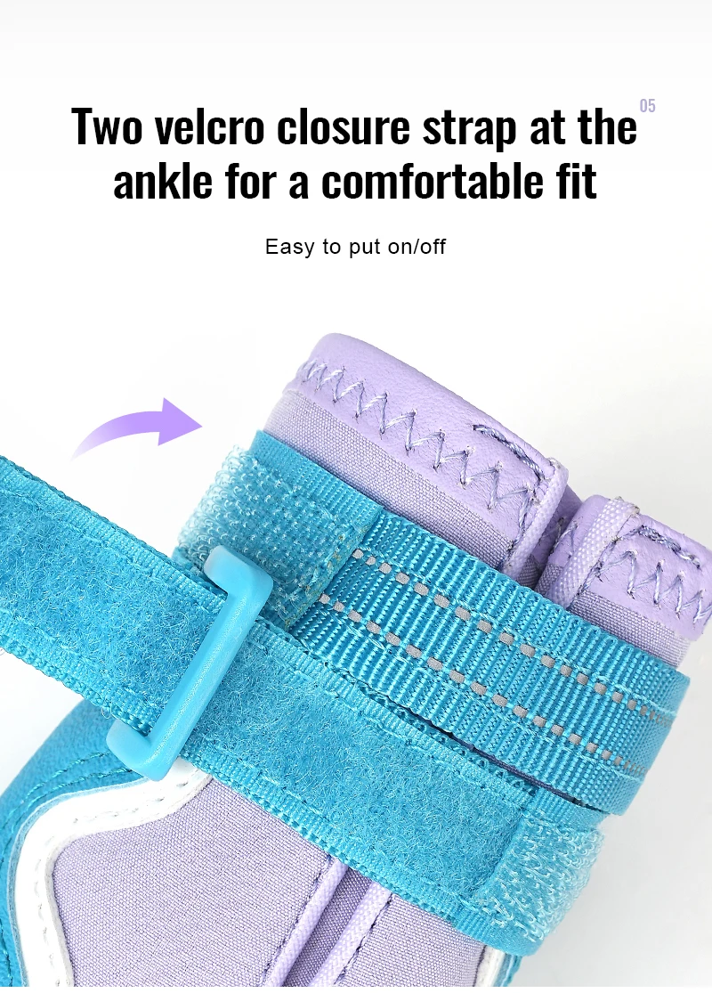 Estos zapatos para perros están diseñados para brindar seguridad y comodidad.Cuentan con un mecanismo fácil de usar para poner y quitar, facilitado por una amplia abertura de costura dividida.Además, los zapatos cuentan con dos correas ajustables y reflectantes que no solo garantizan un ajuste perfecto sino que también mejoran la visibilidad, haciendo que su compañero canino esté seguro incluso durante los paseos nocturnos.