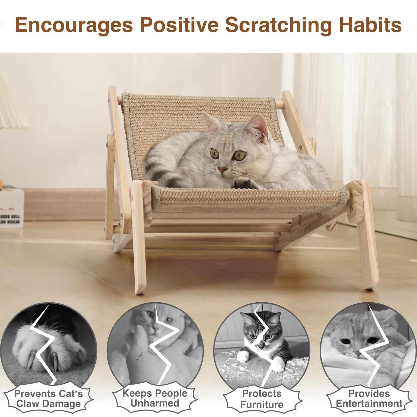 Tumbona para gatos ajustable de tres posiciones Diseño de madera maciza Combina una cama para gatos y un poste rascador en un juguete para gatos estilo sofá