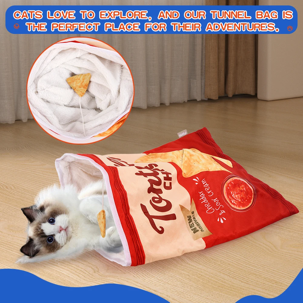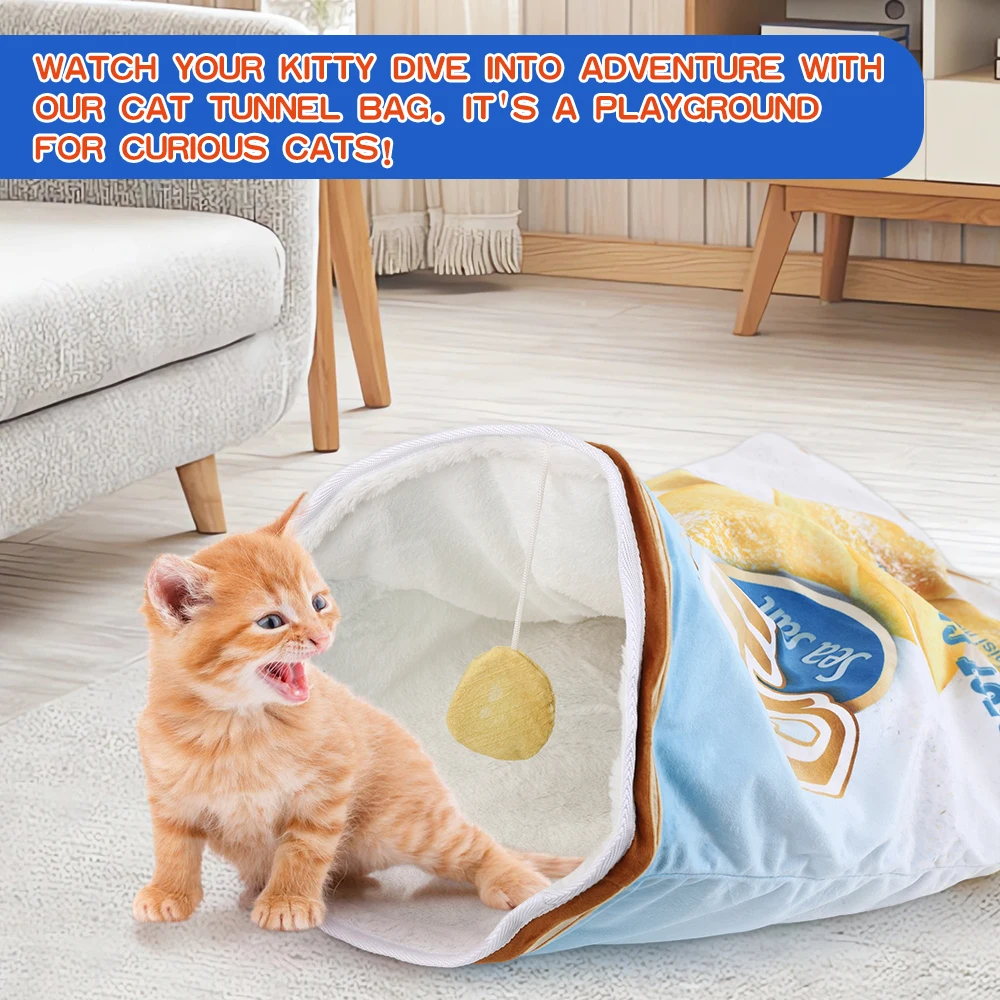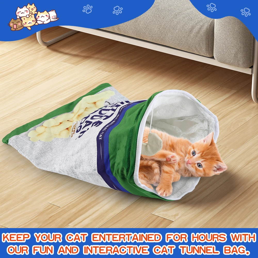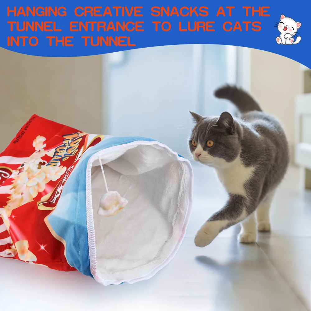 Crinkle Paper Cat Tunnel with Hanging Toys: This foldable cat tunnel is a versatile play space for your pet, featuring crinkle paper that makes noise as they play. Choose from 12 food-themed designs, each with hanging decorations to keep your cat engaged
