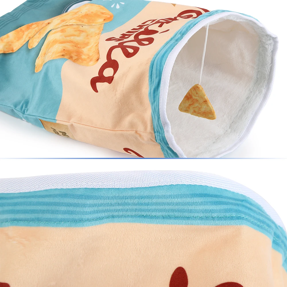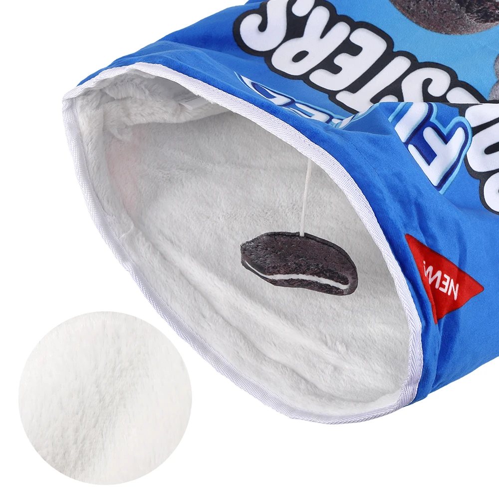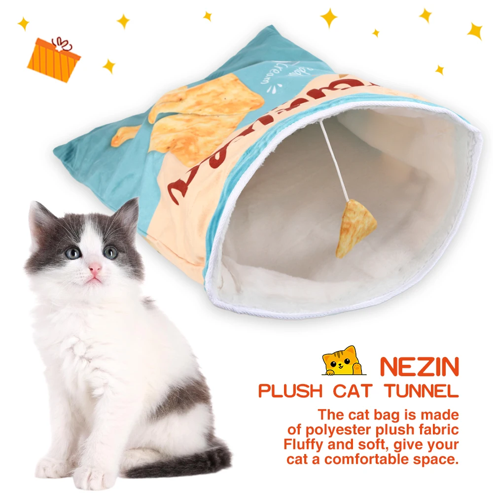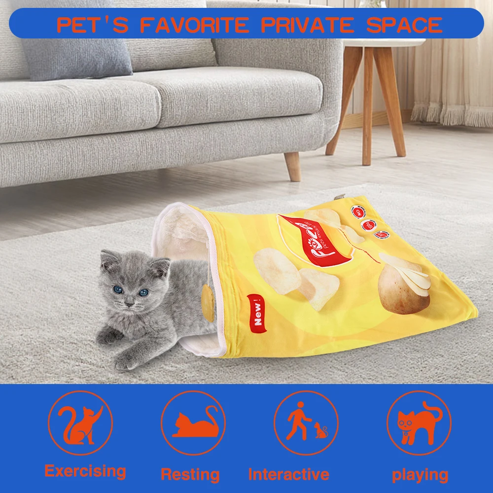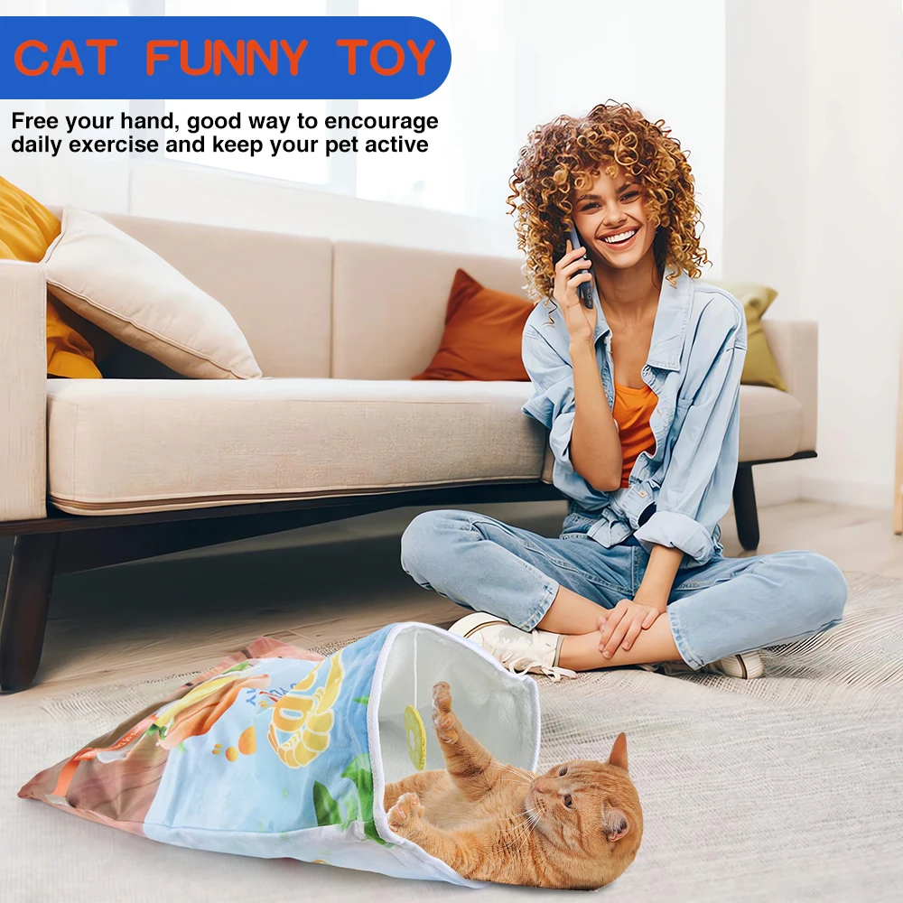 Crinkle Paper Cat Tunnel with Hanging Toys: This foldable cat tunnel is a versatile play space for your pet, featuring crinkle paper that makes noise as they play. Choose from 12 food-themed designs, each with hanging decorations to keep your cat engaged