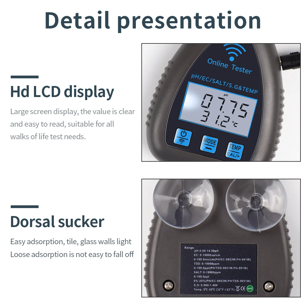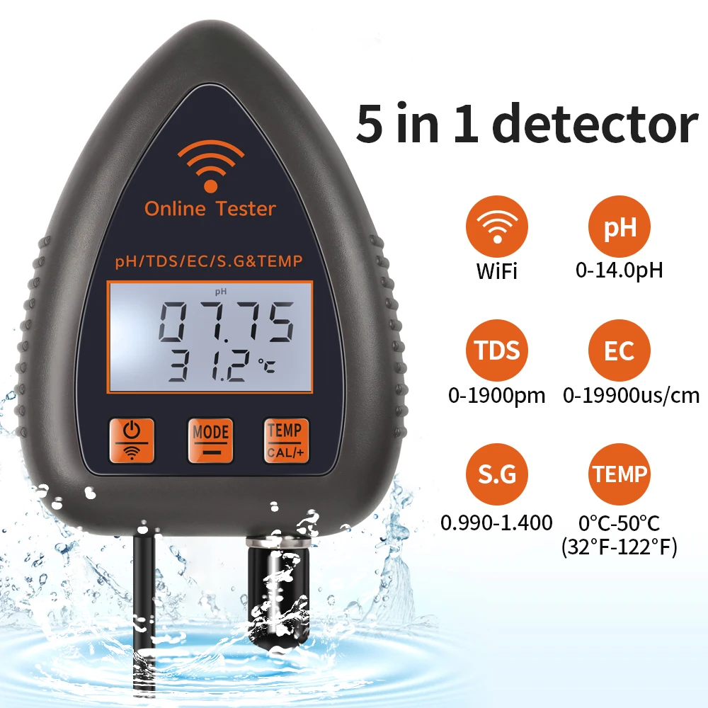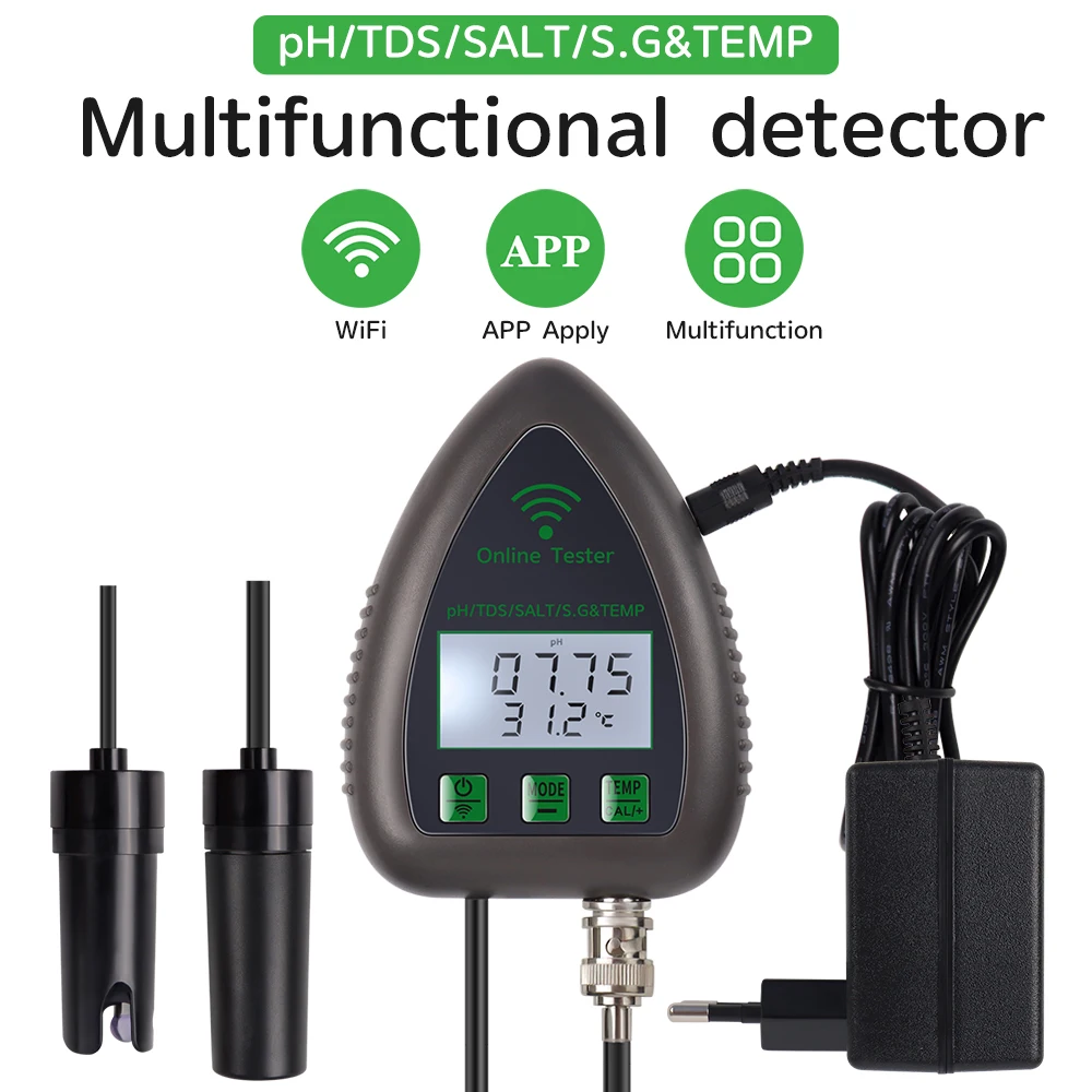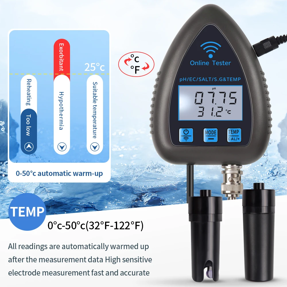 Este es un instrumento fácil de usar para probar la calidad del agua potable, acuario, hidroponía, piscina, etc. Es multifuncional y puede probar PH / EC / SALT / S.G/Temperatura. Además, es compatible con el control remoto de la aplicación, lo que hace que sea más conveniente monitorear en cualquier momento y en cualquier lugar.
