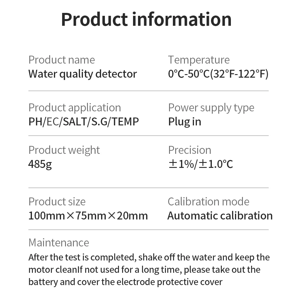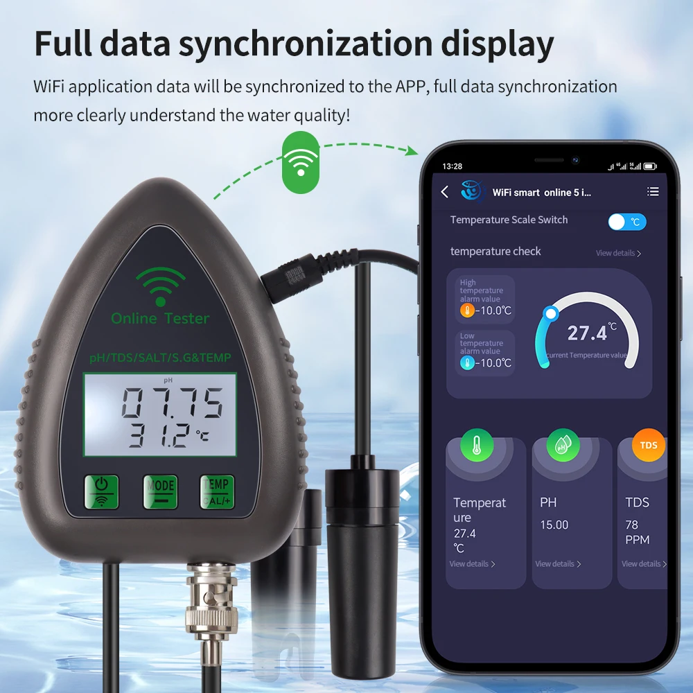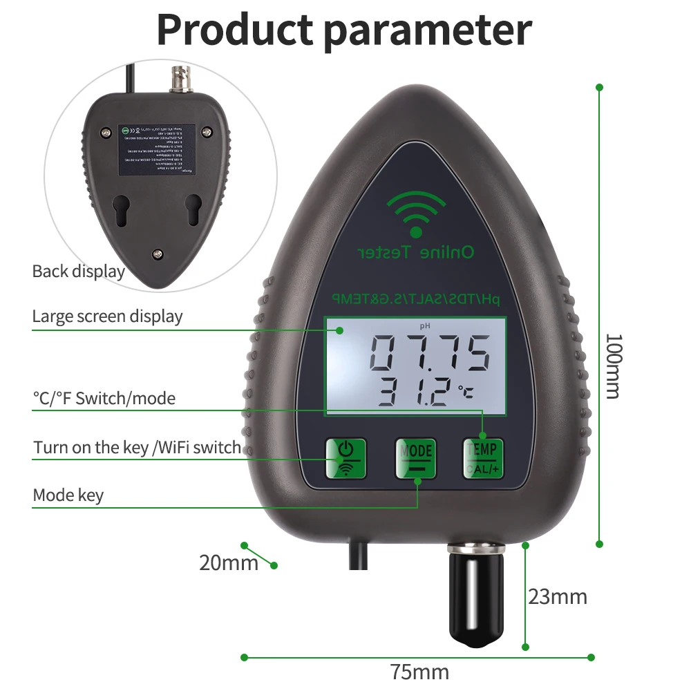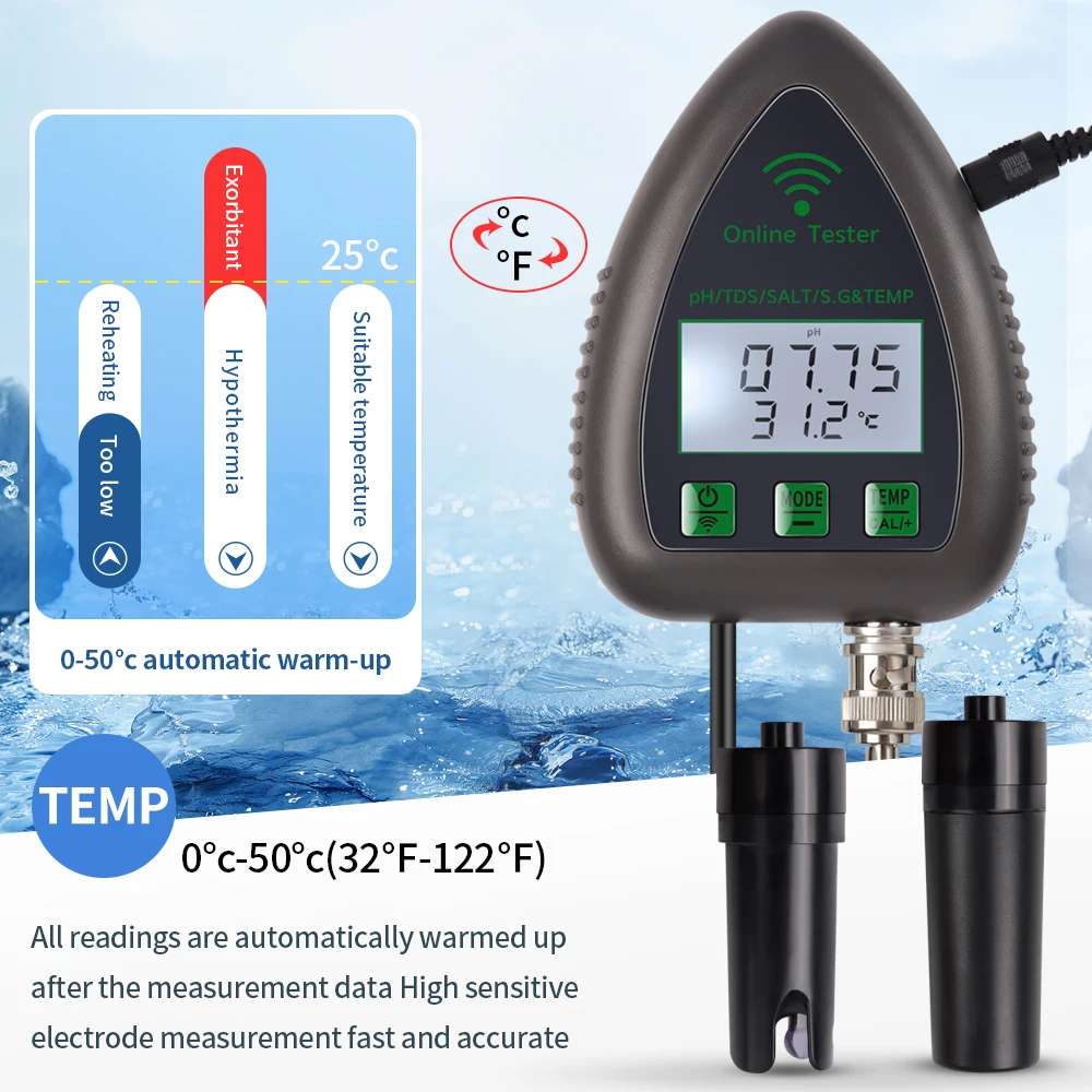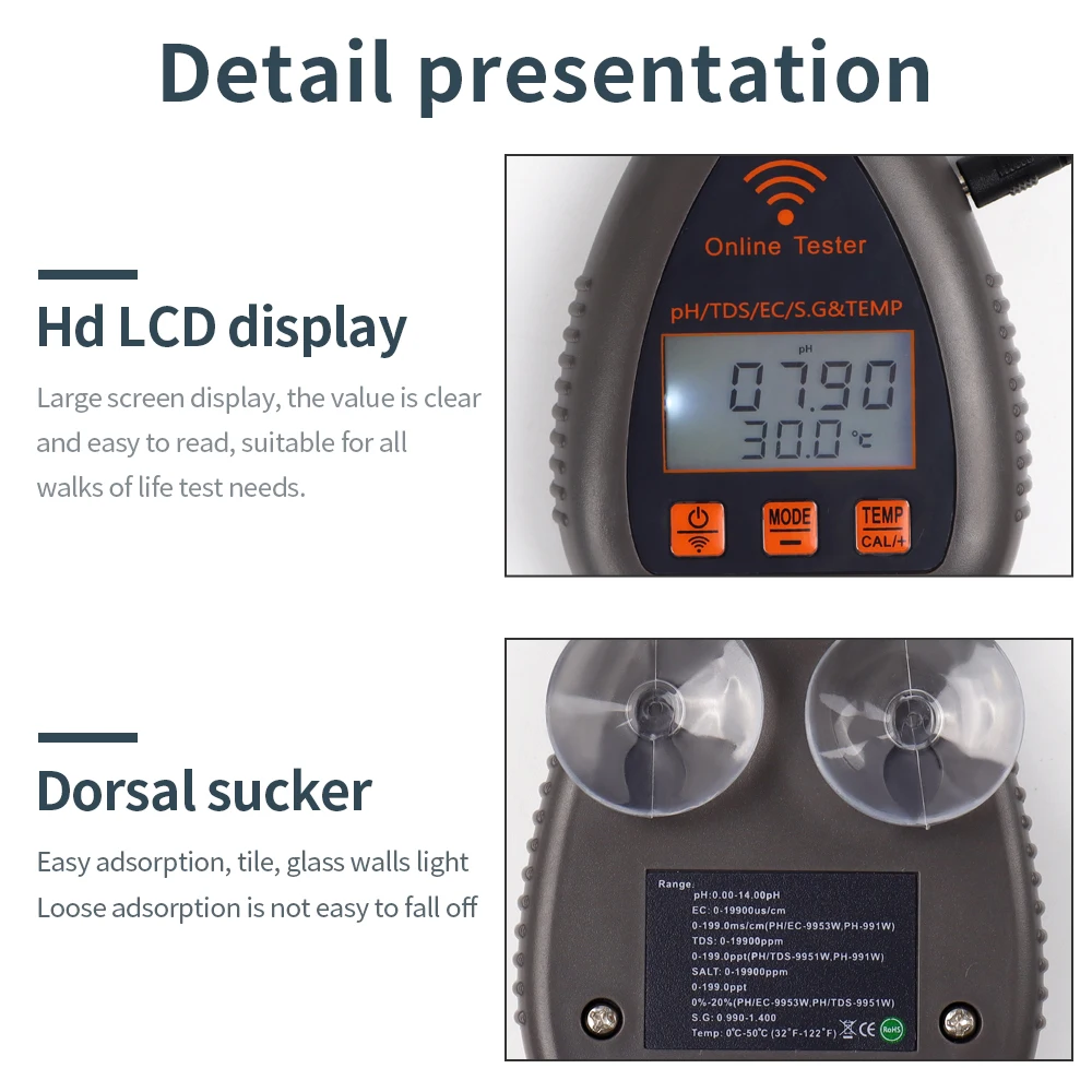 Este es un instrumento fácil de usar para probar la calidad del agua potable, acuario, hidroponía, piscina, etc. Es multifuncional y puede probar PH / EC / SALT / S.G/Temperatura. Además, es compatible con el control remoto de la aplicación, lo que hace que sea más conveniente monitorear en cualquier momento y en cualquier lugar.