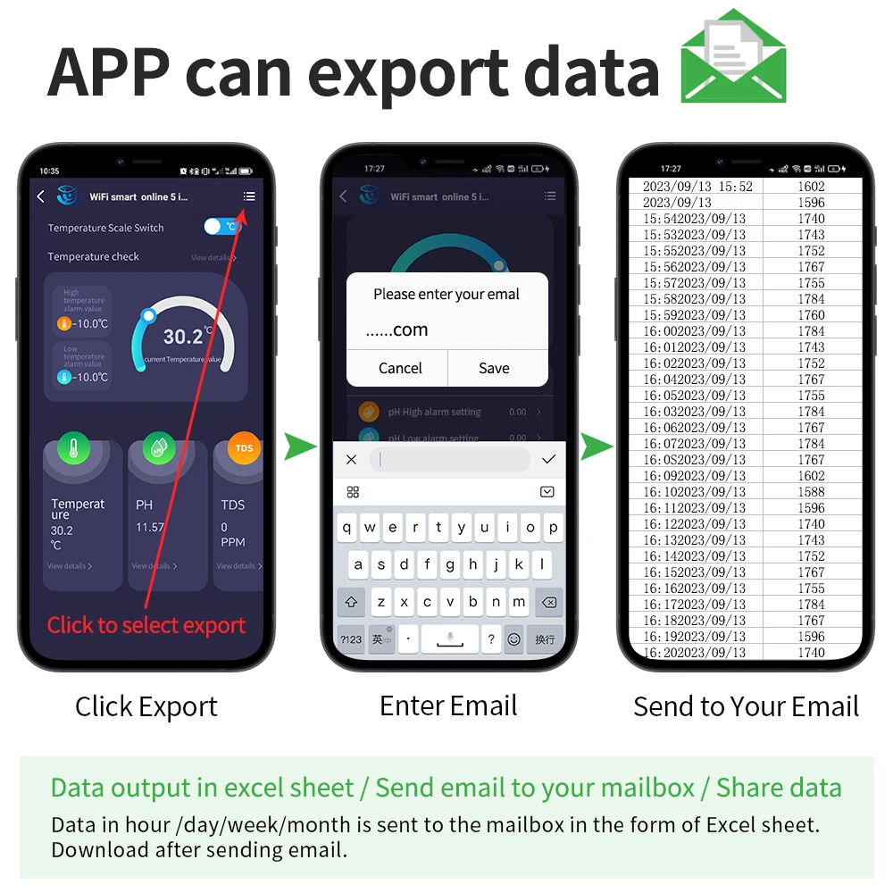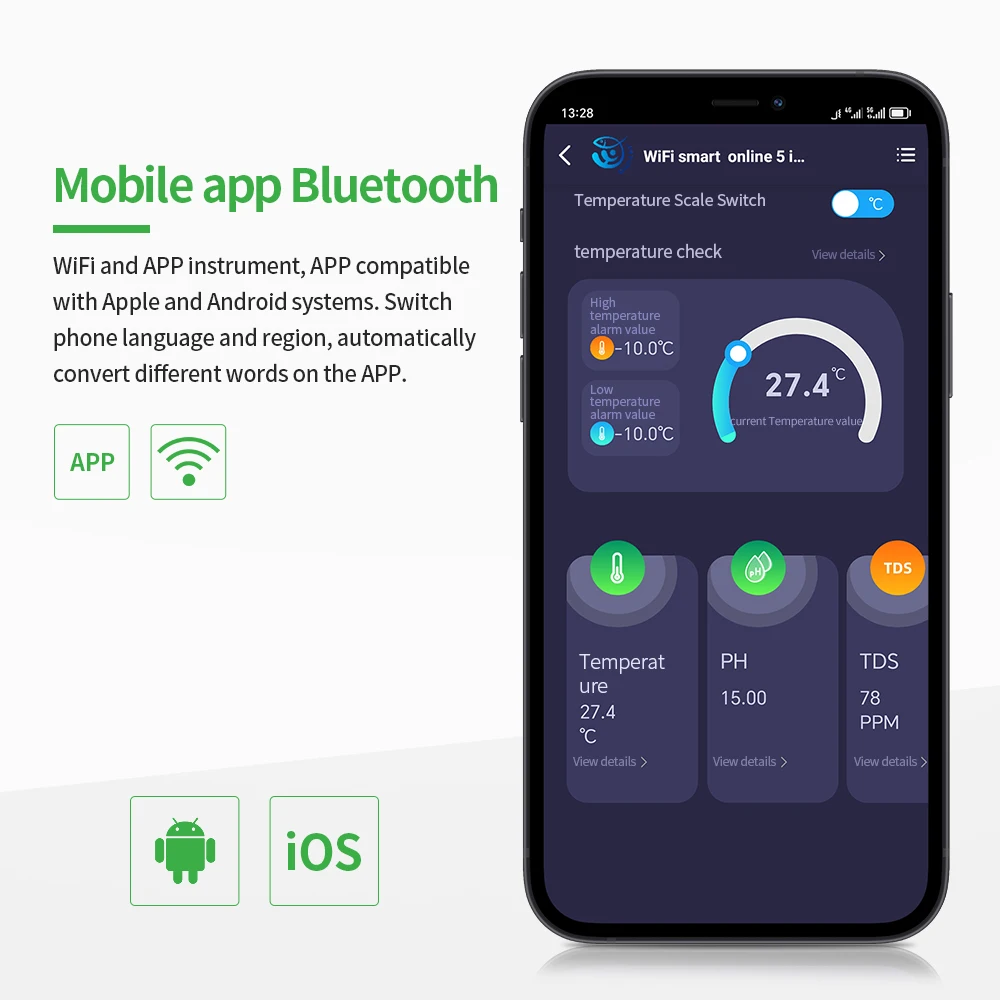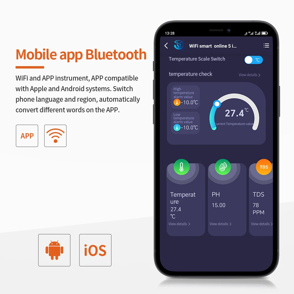 Es compatible con el control remoto de la aplicación, más conveniente para monitorear el probador de calidad del agua en cualquier momento y en cualquier lugar. También puede establecer el valor de alarma en la APP.