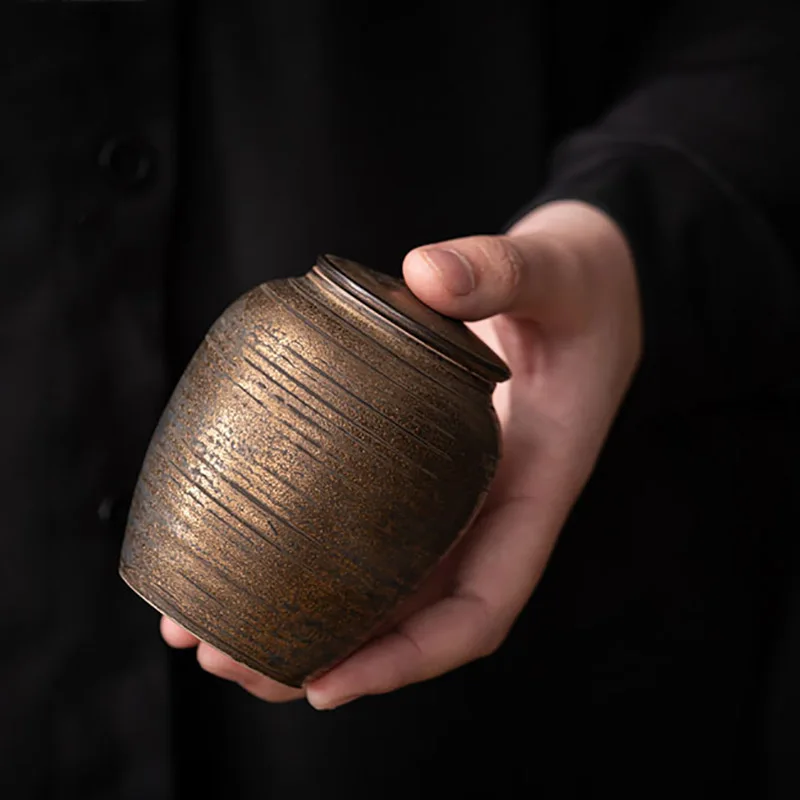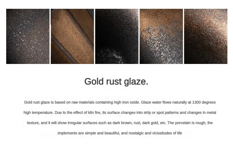 El esmalte de óxido de oro se basa en materias primas con alto contenido de óxido de hierro. El agua glaseada fluye naturalmente a una temperatura alta de 1300 grados, debido al efecto del fuego del horno, la superficie cambia al horno para formar tiras o patrones de puntos Y textura de metal, y la quema presentará superficies irregulares como marrón oscuro, óxido, oro oscuro, porcelana en bruto, utensilios simples y hermosos, vicisitudes nostálgicas