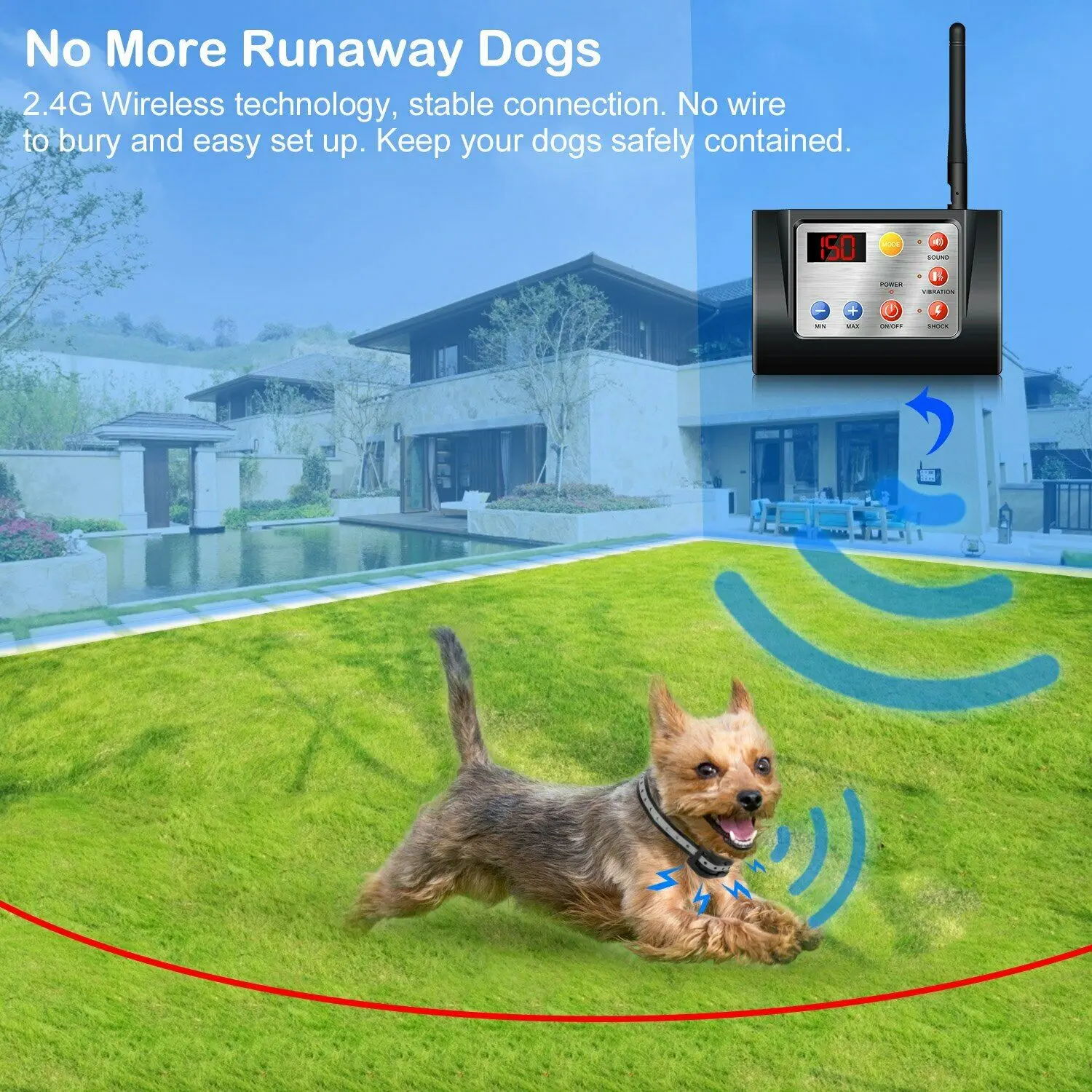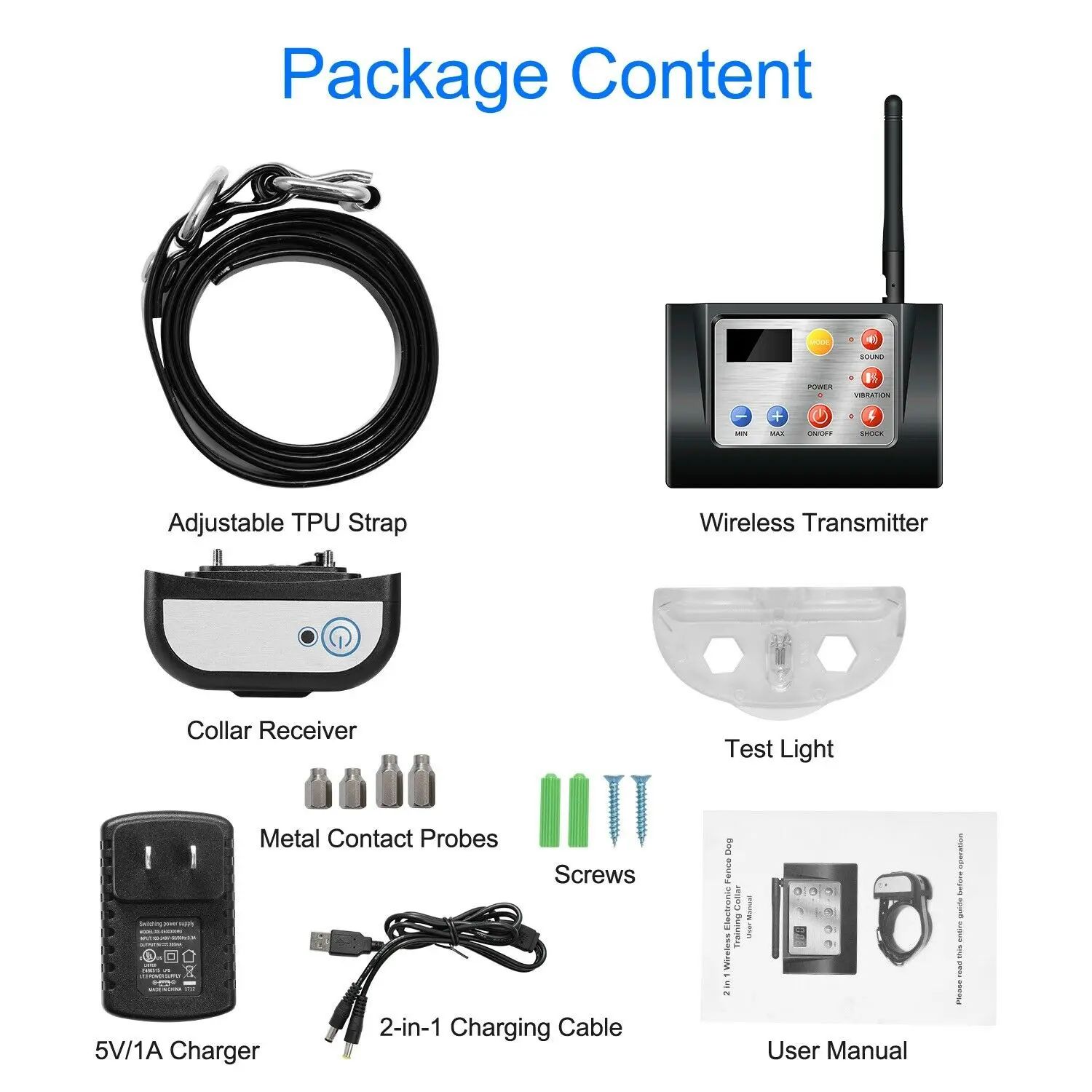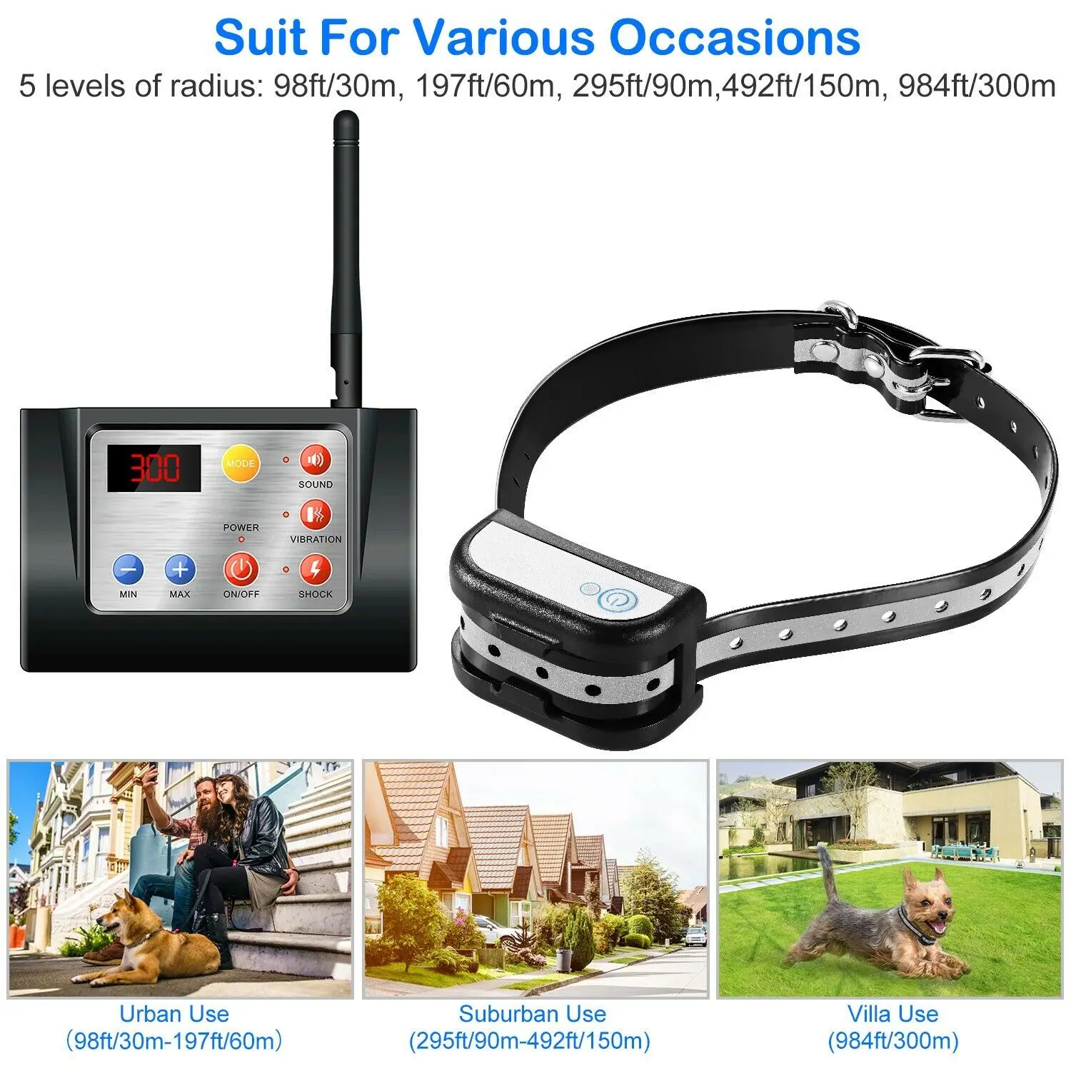 - *2 IN 1 WIRELESS DOG TRAINING SOLUTION:Combine wireless dog fence system with dog training system(Sound/Vibration/Electric Shock Mode), an effective solution to offer your pet great freedom to play safely. Offering up to 984ft/300m radius distance and 300000 square feet area to limit the active region of your dog. When your naughty dog exceeds the set range, the receiver will automatically start the training function (Sound and Static Shock).