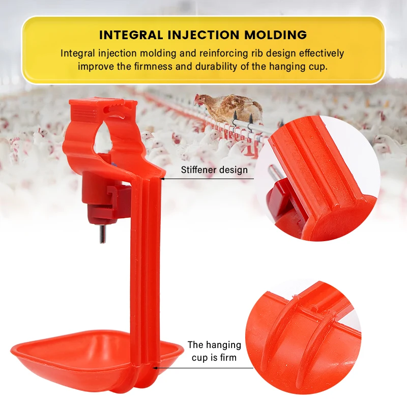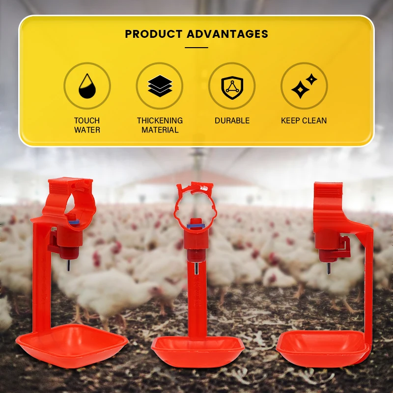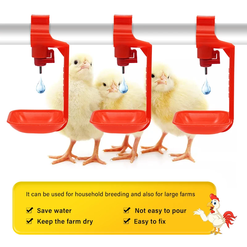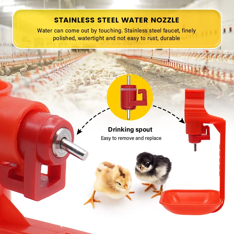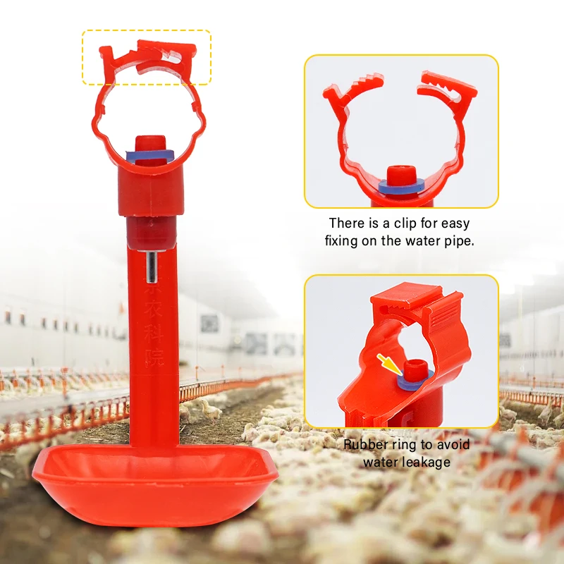 Estos bebederos para tetinas de pollo son un nuevo producto desarrollado a medida que los agricultores lo exigen, que puede reducir eficazmente el agua y mantener la casa limpia. Cada vez que el pollo toque la tetina, el agua goteará automáticamente. El Sistema de bebida de pezón proporciona agua fresca y limpia para los pollos automáticamente, lo cual es muy vital para que el pollo tenga un buen ambiente de crecimiento. Taladro (tamaño de broca 7mm) en la parte inferior del PVC (tamaño de la tubería 3/4 o 22/25/26mm) y luego empuje la boquilla amarilla (asegúrese de que la arandela de goma esté encima) agujero interior firmemente y luego sujételo.