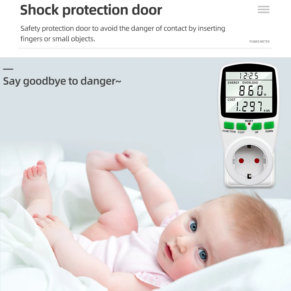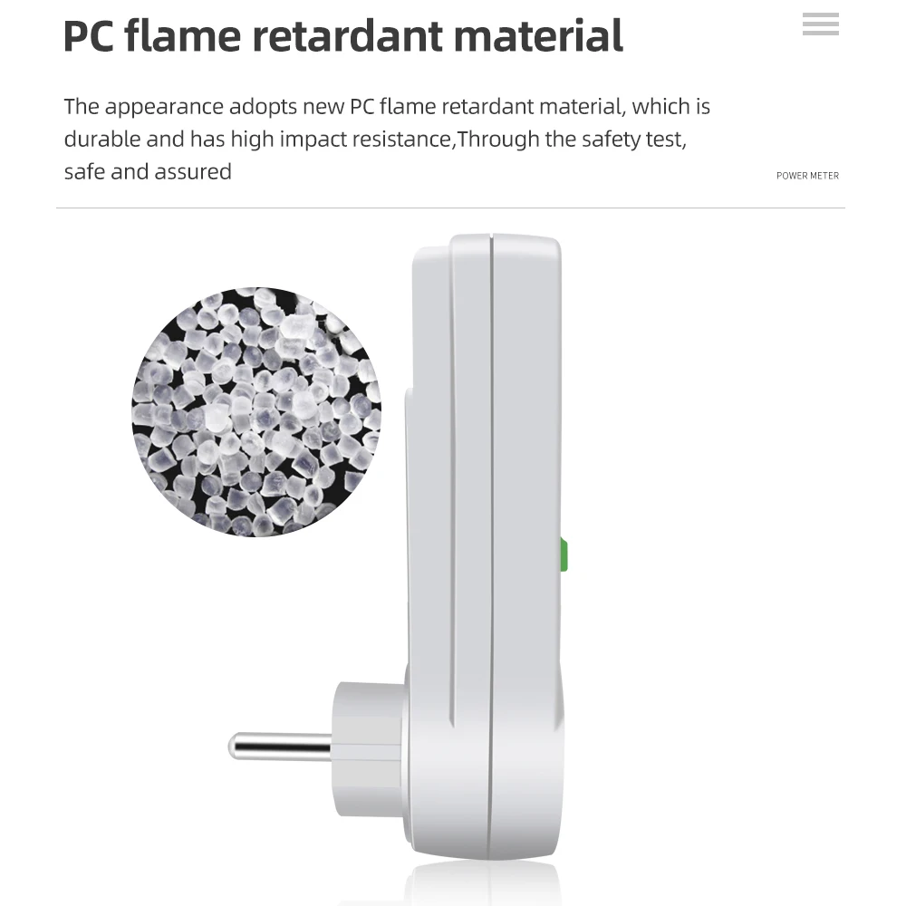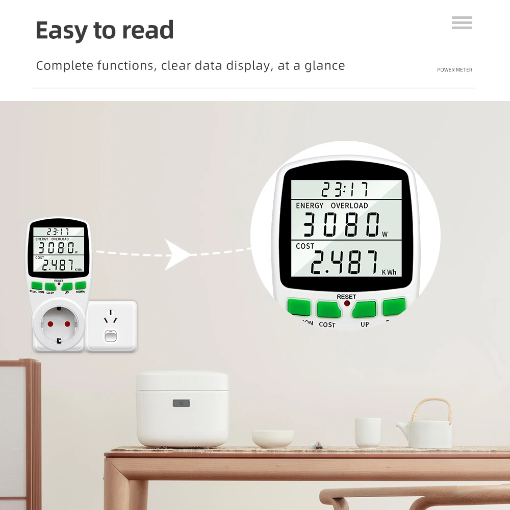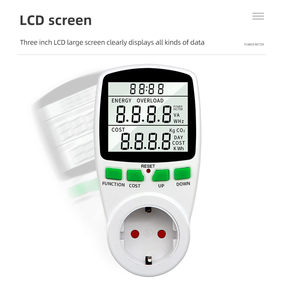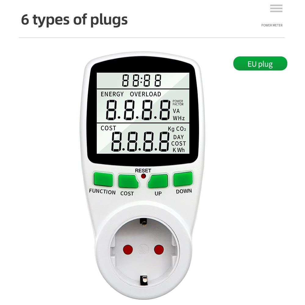 El medidor de potencia puede medir el consumo de energía de aparatos eléctricos, las emisiones de caebon y el costo de la electricidad. Ayuda a los usuarios a realizar un seguimiento de su consumo eléctrico y reducir las emisiones de energía y carbono.