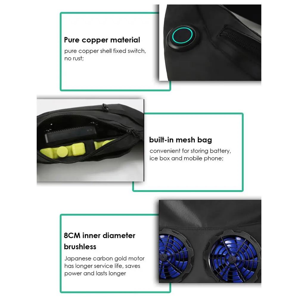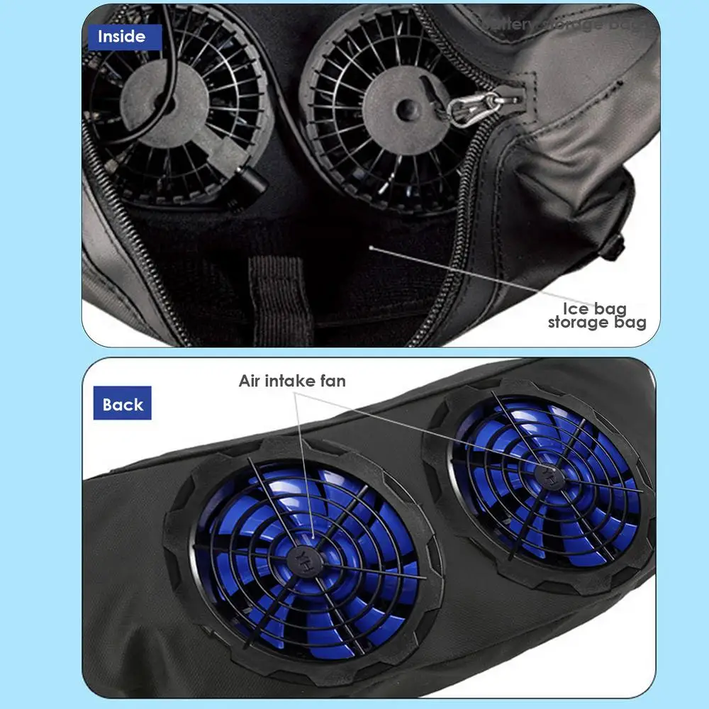 2. Supervolumen de aire: eleve su verano con las nueve hojas de ventilador de nuestro ventilador de cintura, bolsillo de malla para almacenamiento de refrigerante, supervolumen de aire y ajuste de velocidad del viento de tres niveles, asegurando una brisa bien cuidada.