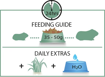 En función del tamaño, la raza y la edad de la cobaya, se recomienda una ración diaria media de 35 a 50 g de alimento.