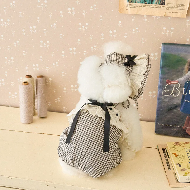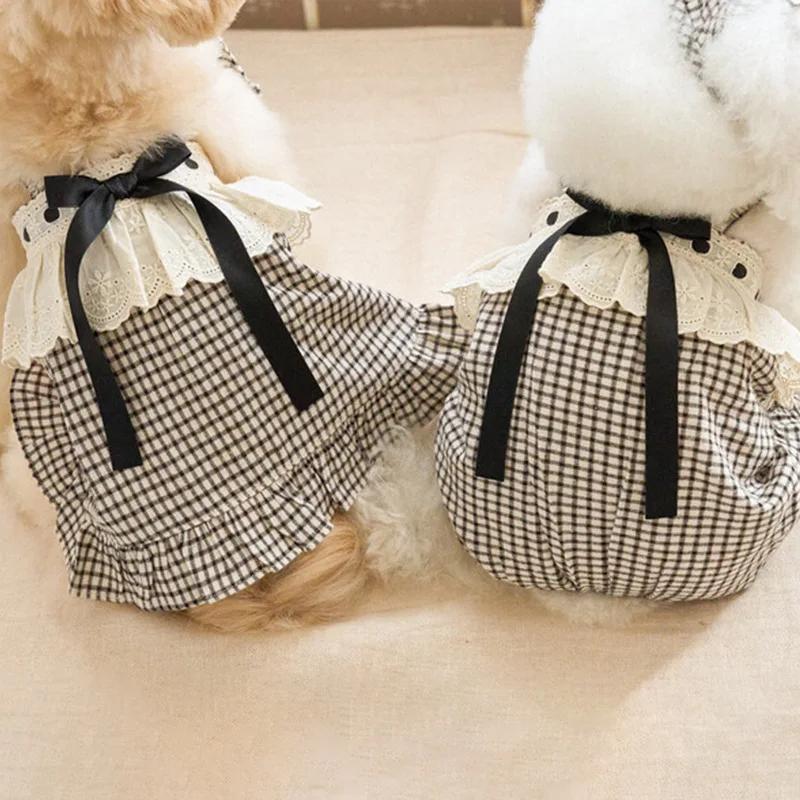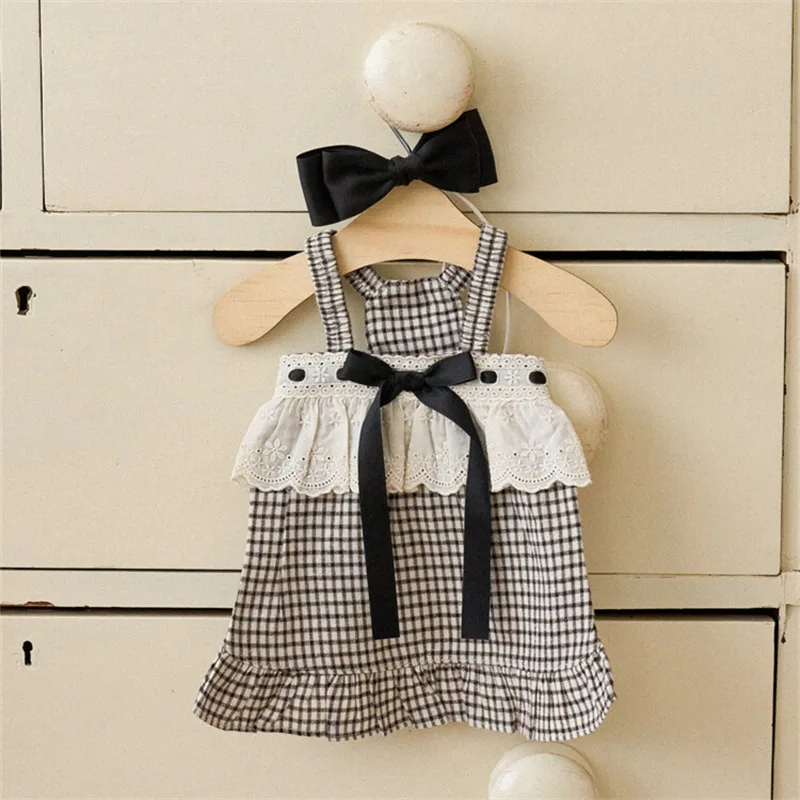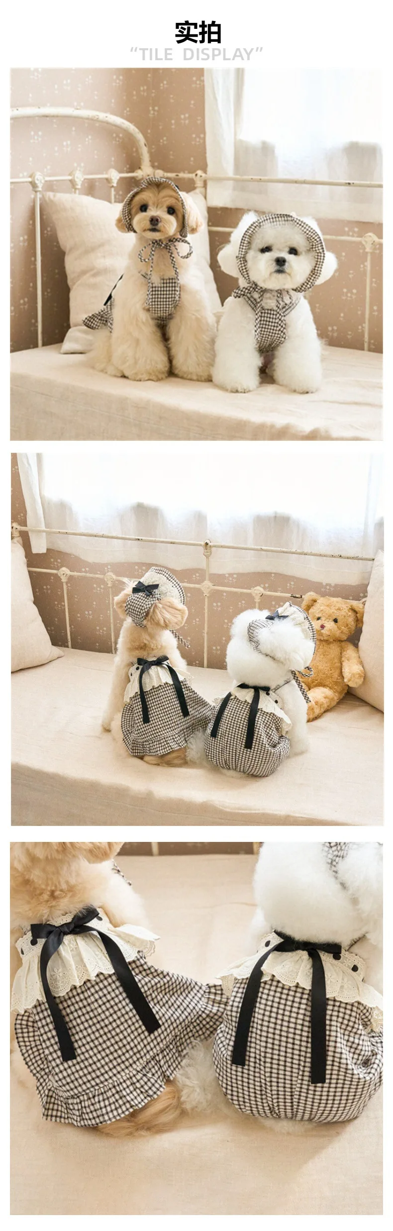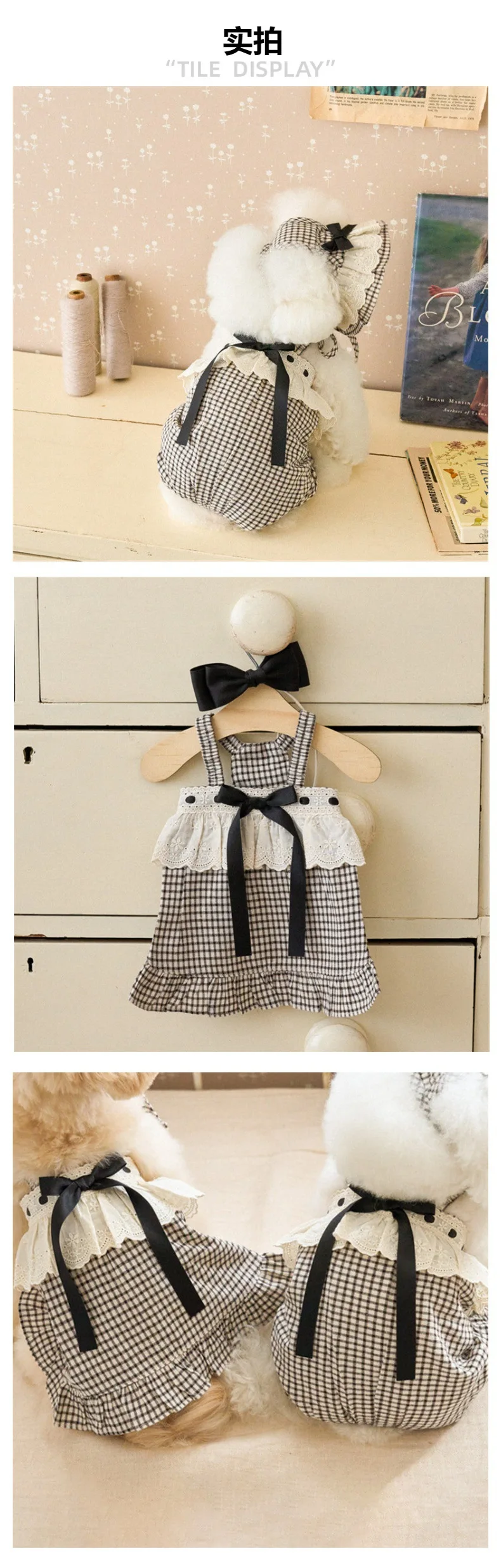 Vestido camisola a cuadros para primavera y verano para mascotas, ropa bonita con lazo para gatos, chaleco a cuadros de encaje con lazo, vestido de princesa, diadema con lazo para cachorro