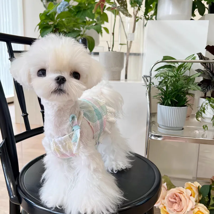 Es bonito. El Bichón Frisé pesa 7 kg, así que la talla XL queda un poco ajustada... pero me gusta el vestido de verano.
