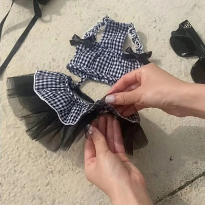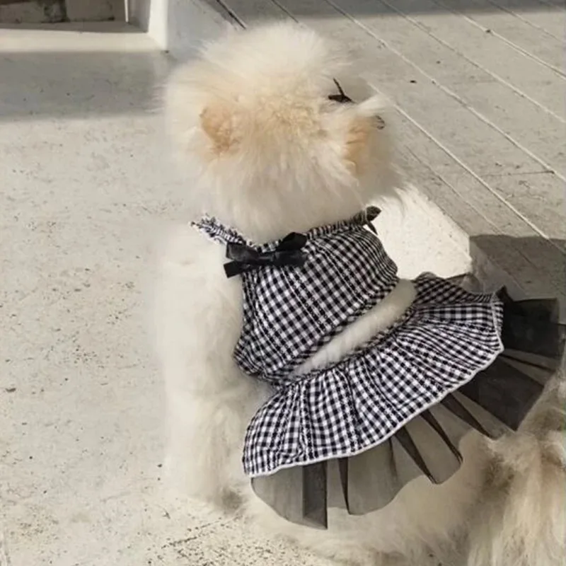 Vestido a cuadros blanco y negro para perro, vestido con tirantes y volantes de encaje de Organza para perro pequeño, vestido de fiesta de cumpleaños, ropa para perro gatito