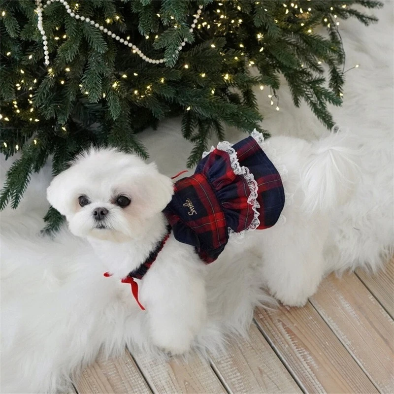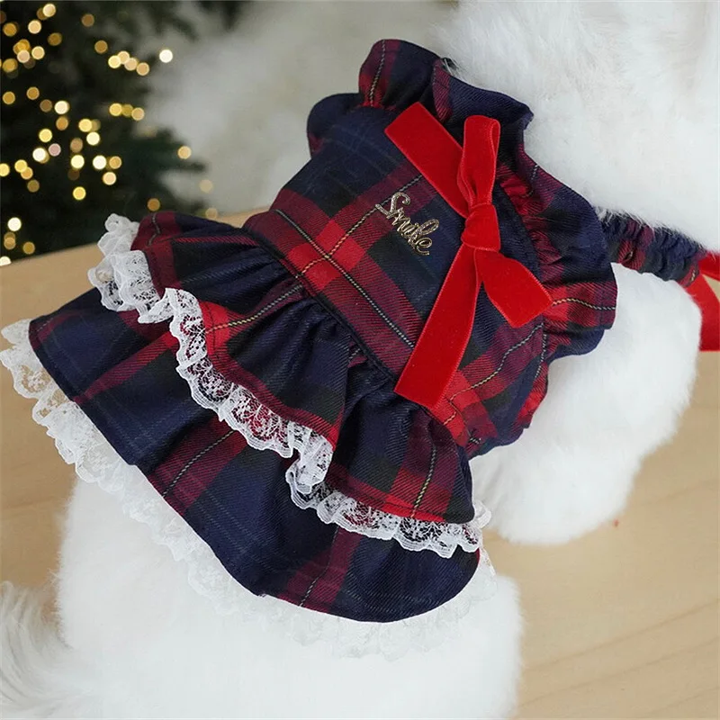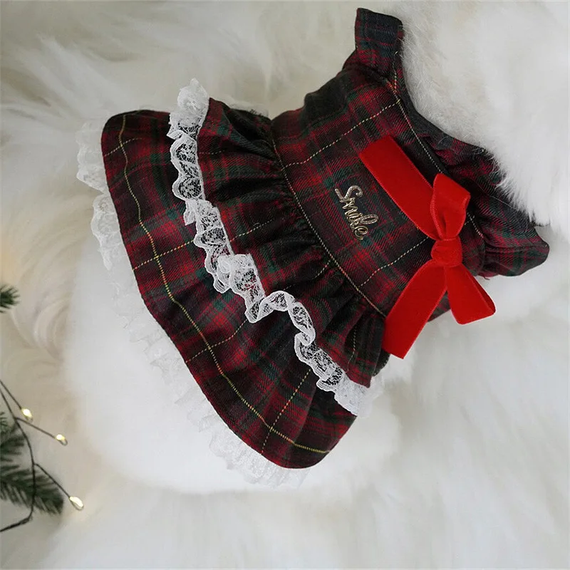 Vestido a cuadros de lana para otoño e invierno, chaleco de Navidad, ropa de vacaciones para cachorros, abrigo con lazo de encaje, vestidos para perros pequeños