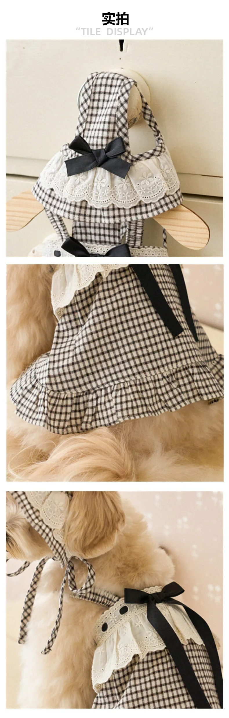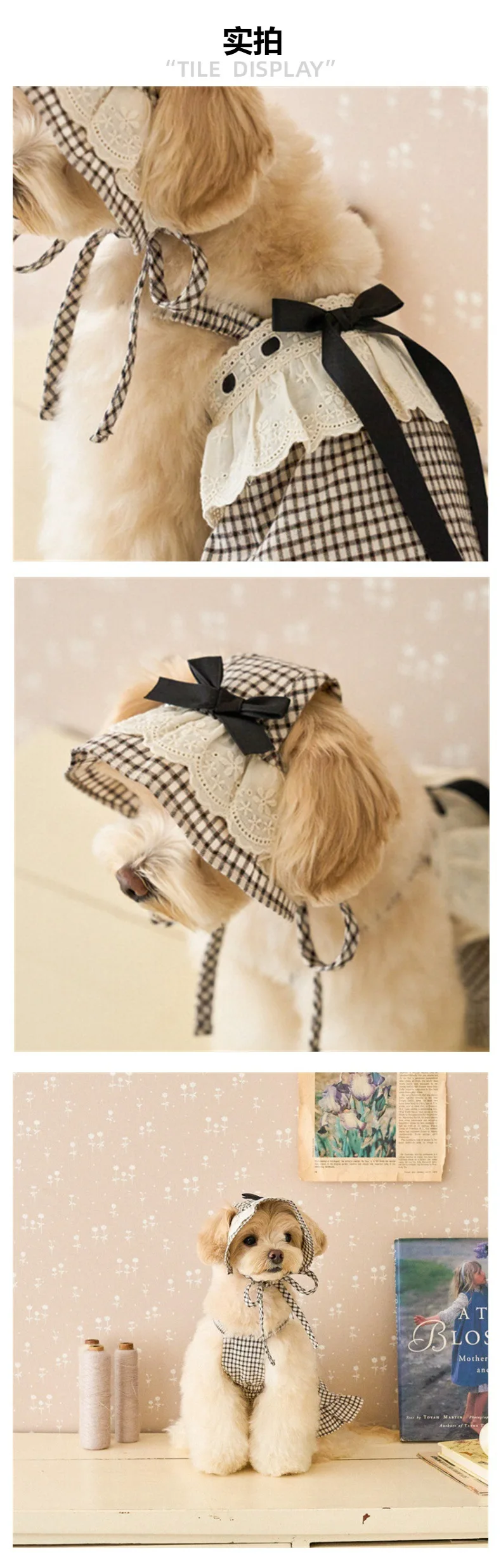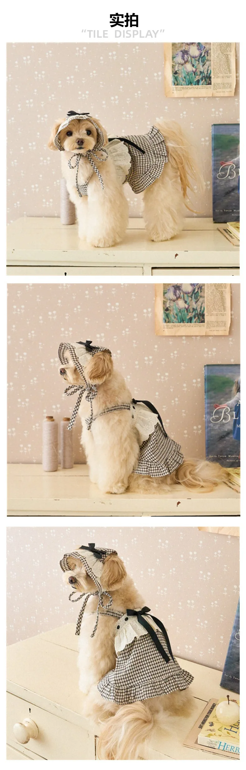 Vestido a cuadros de primavera para mascotas, conjunto de sombrero bonito, ropa para perros y gatos, falda de princesa a cuadros de encaje con lazo, ropa para cachorros pequeños