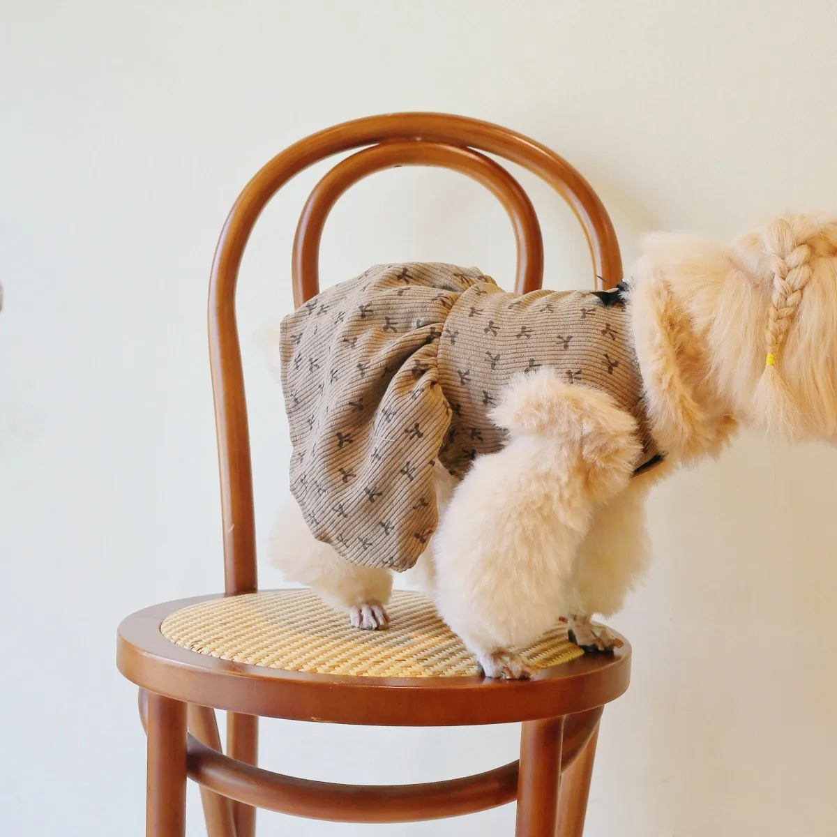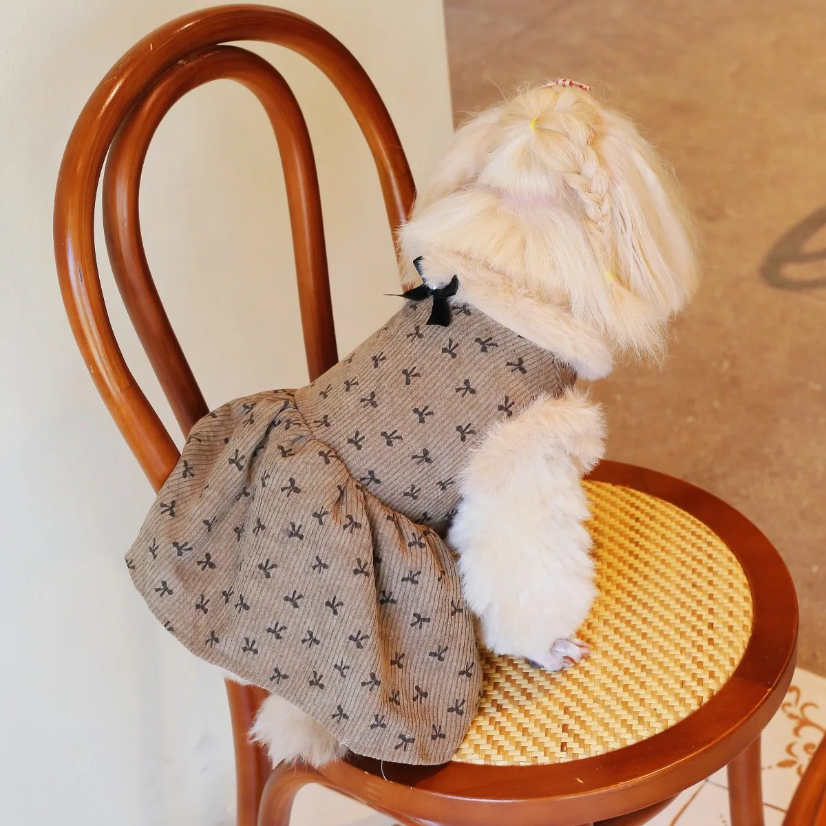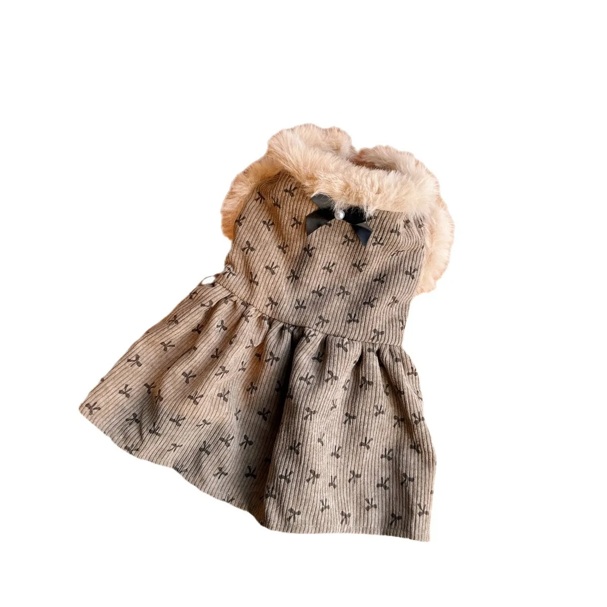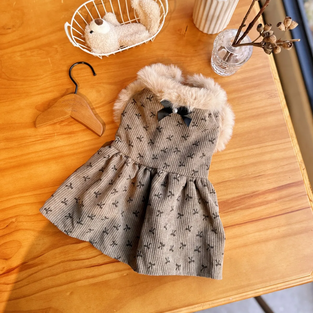 Vestido con cuello de felpa para mascotas, chaqueta de terciopelo de pana, bonito vestido de doble capa con lazo para perros pequeños, ropa para cachorros, otoño e invierno