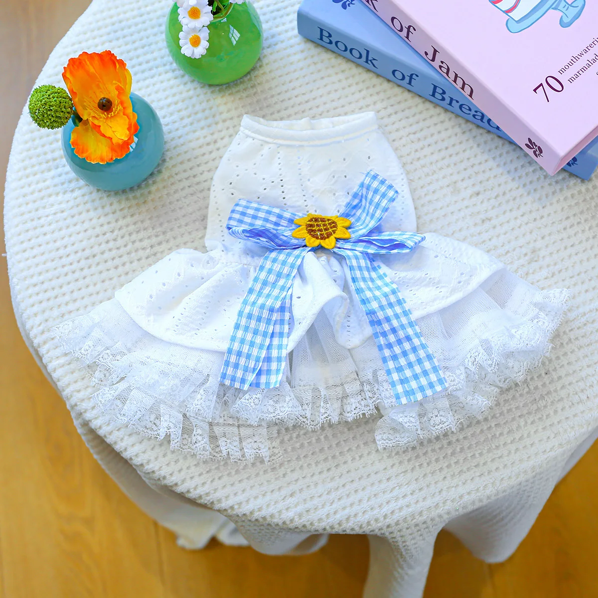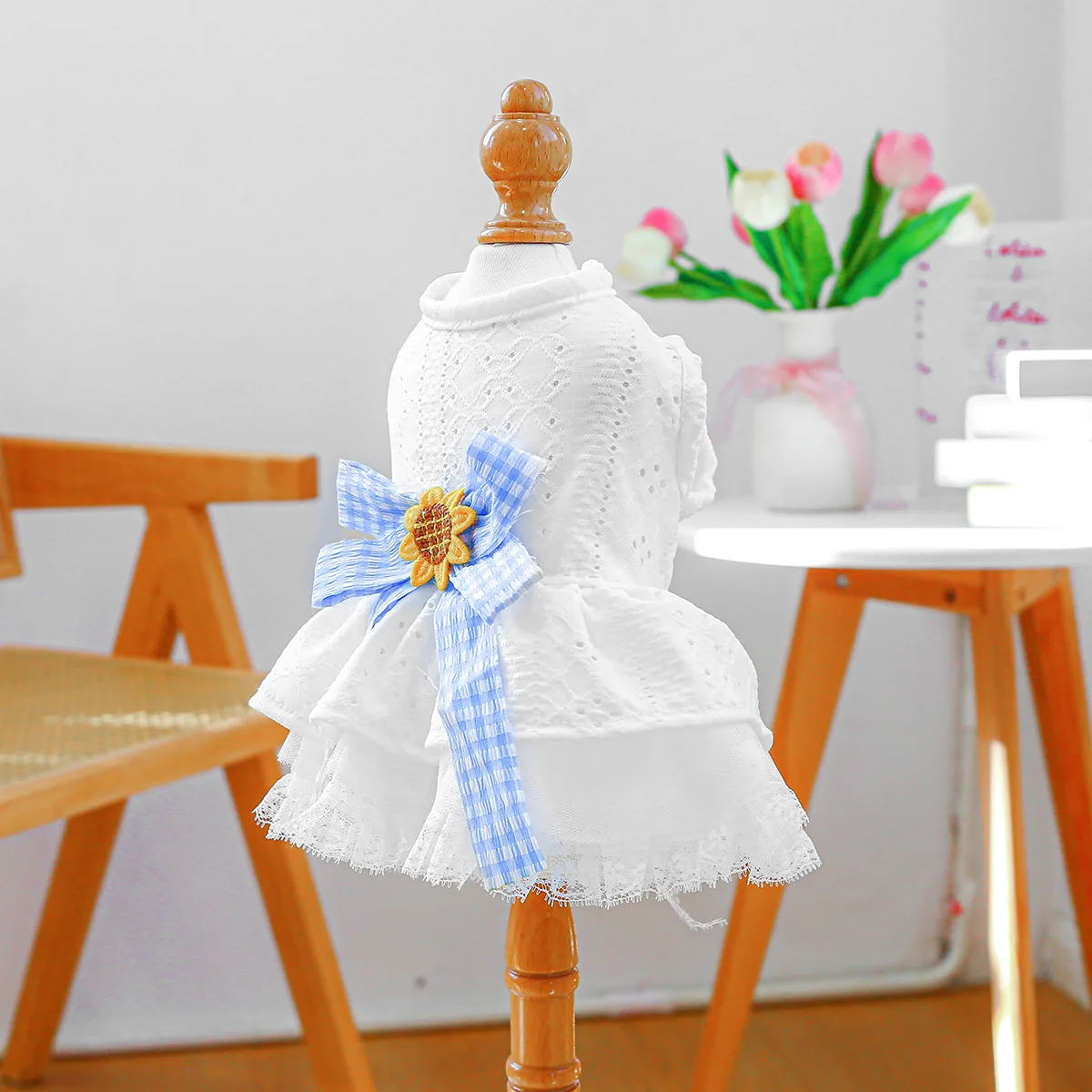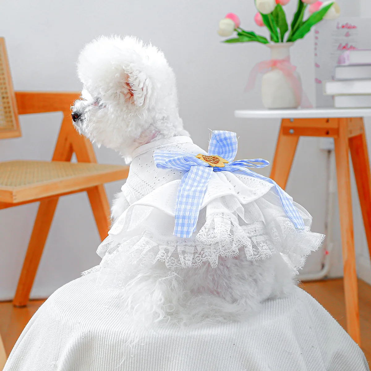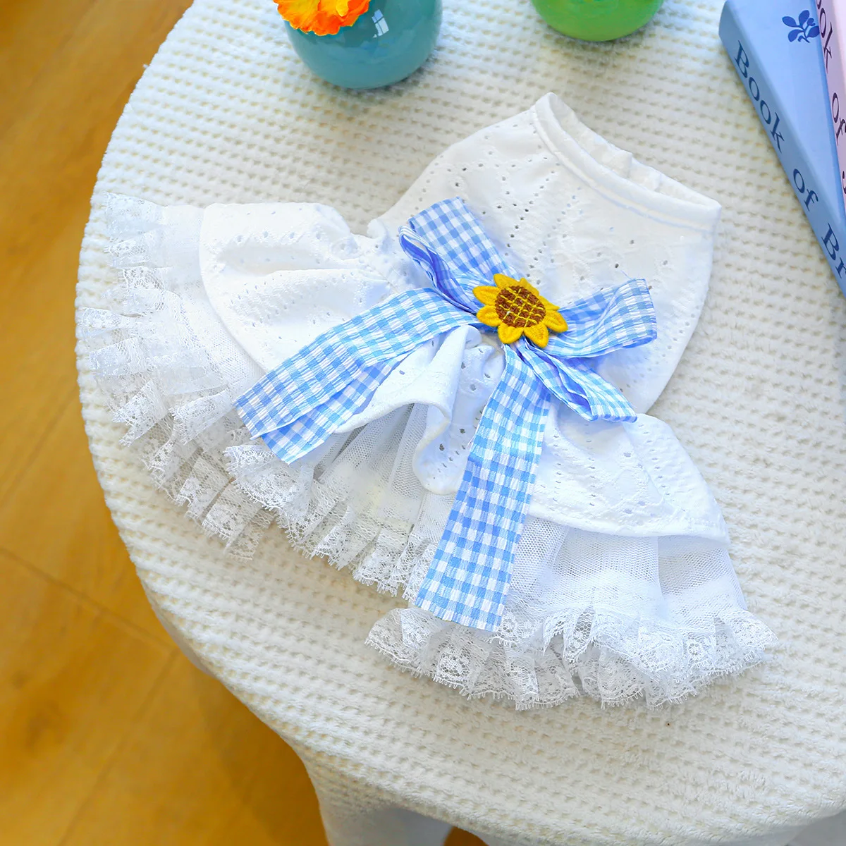 Vestido de encaje de primavera para mascotas, ropa calada para perros, bonito lazo a cuadros, falda esponjosa, vestidos para perros pequeños, ropa para cachorros