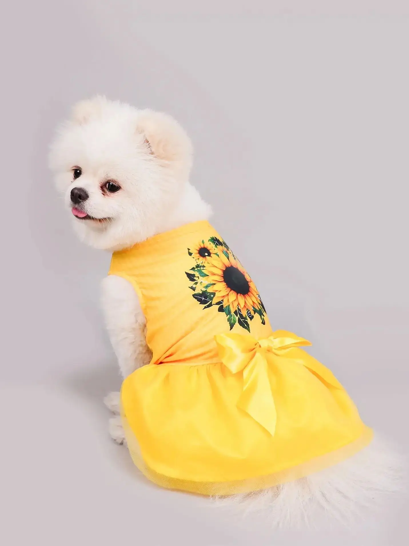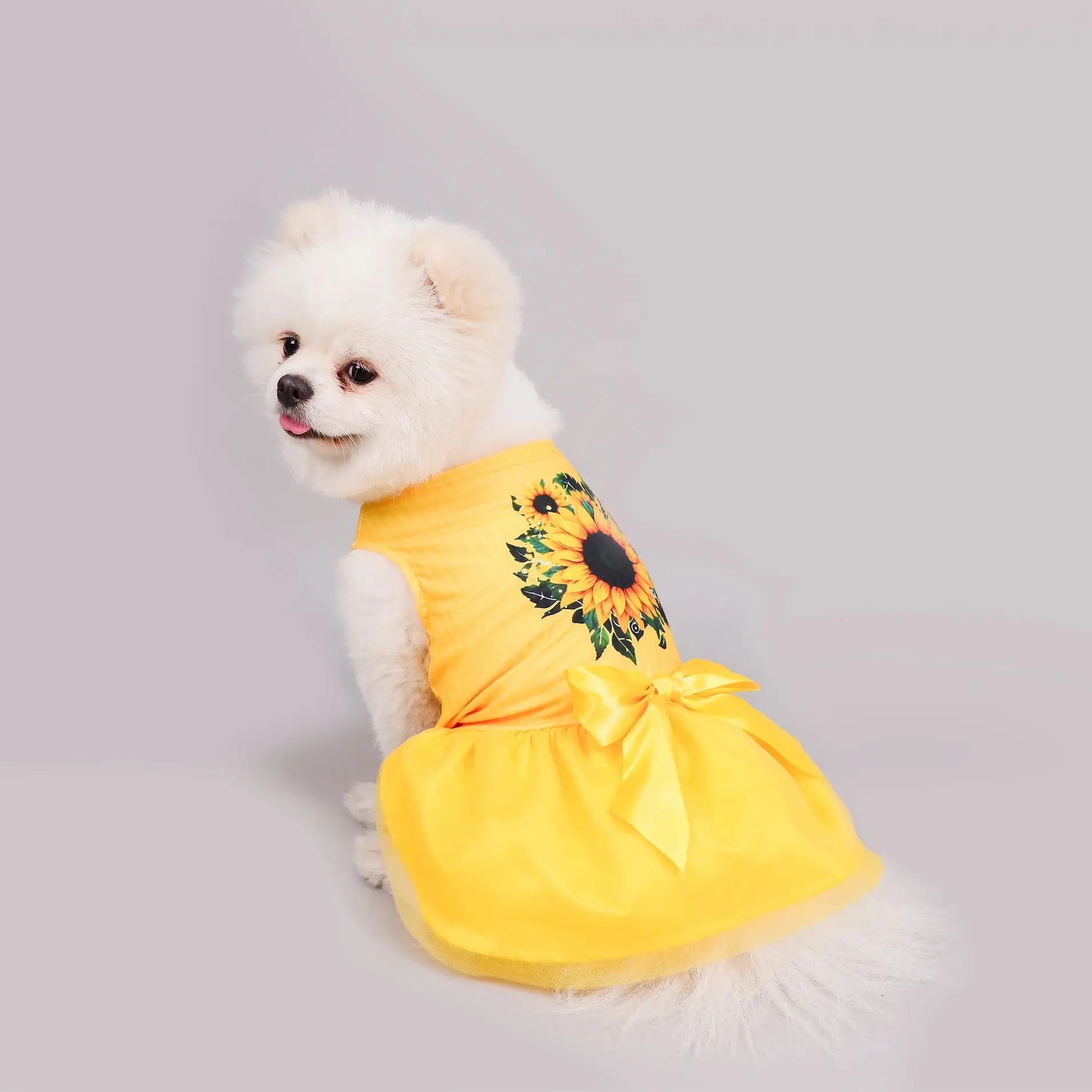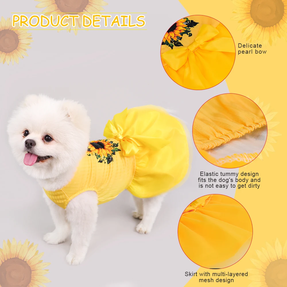 Vestido de girasol para perro, dulce lazo, vestidos para mascotas, falda de princesa con flores amarillas para perros, ropa bonita para vacaciones, traje de verano