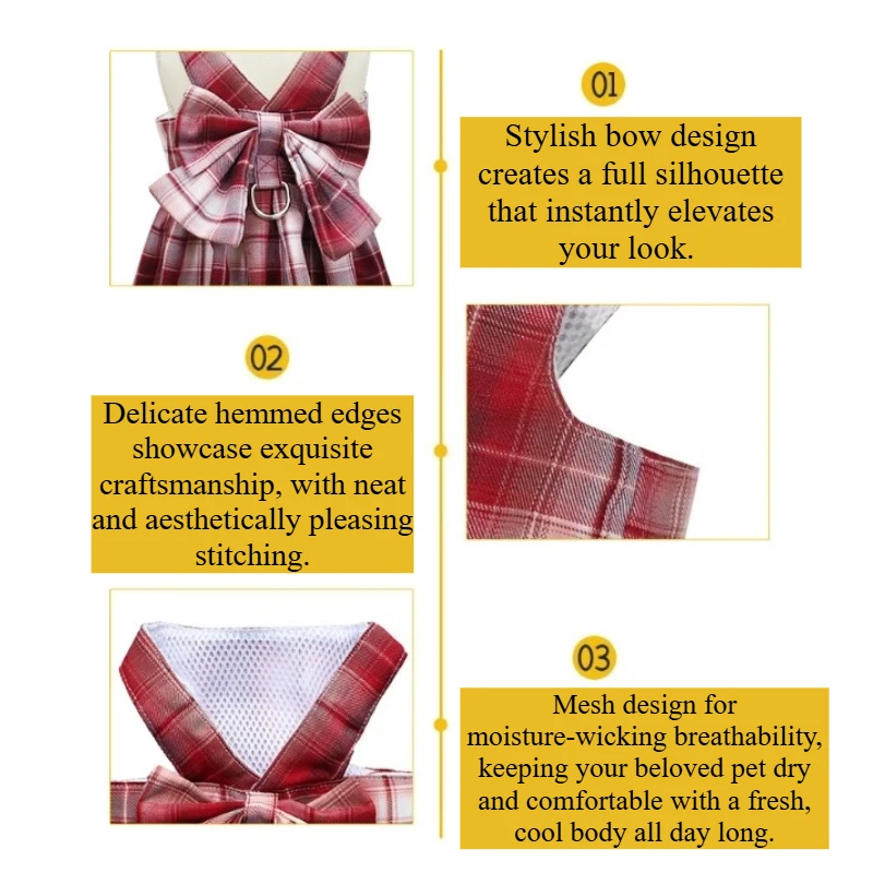 Juego completo de arneses:Incluye un elegante chaleco a cuadros con falda y una correa integrada (3,9 pies), creando un conjunto todo en uno seguro y moderno.