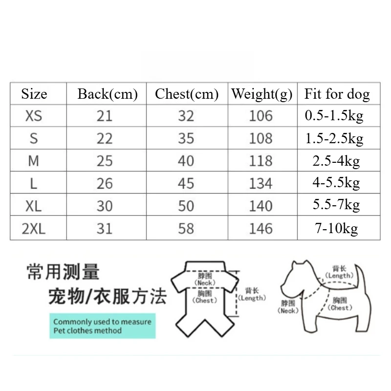 Mida cuidadosamente la circunferencia del pecho y la longitud de la espalda de su mascota antes de realizar el pedido.El tamaño que su mascota normalmente usa puede variar entre marcas, por lo que siempre consulte las medidas reales en lugar de las etiquetas de tamaño solas.