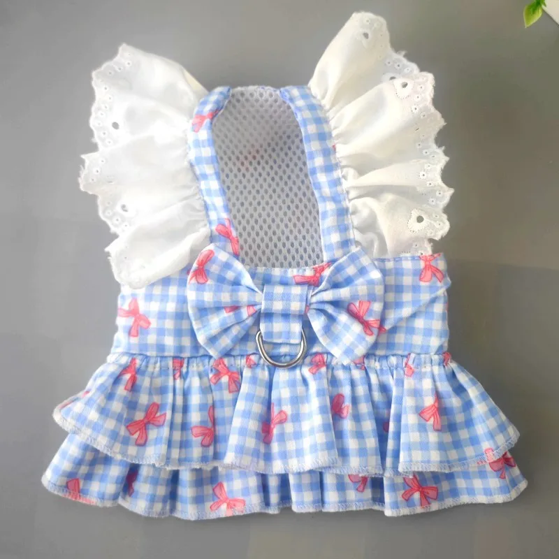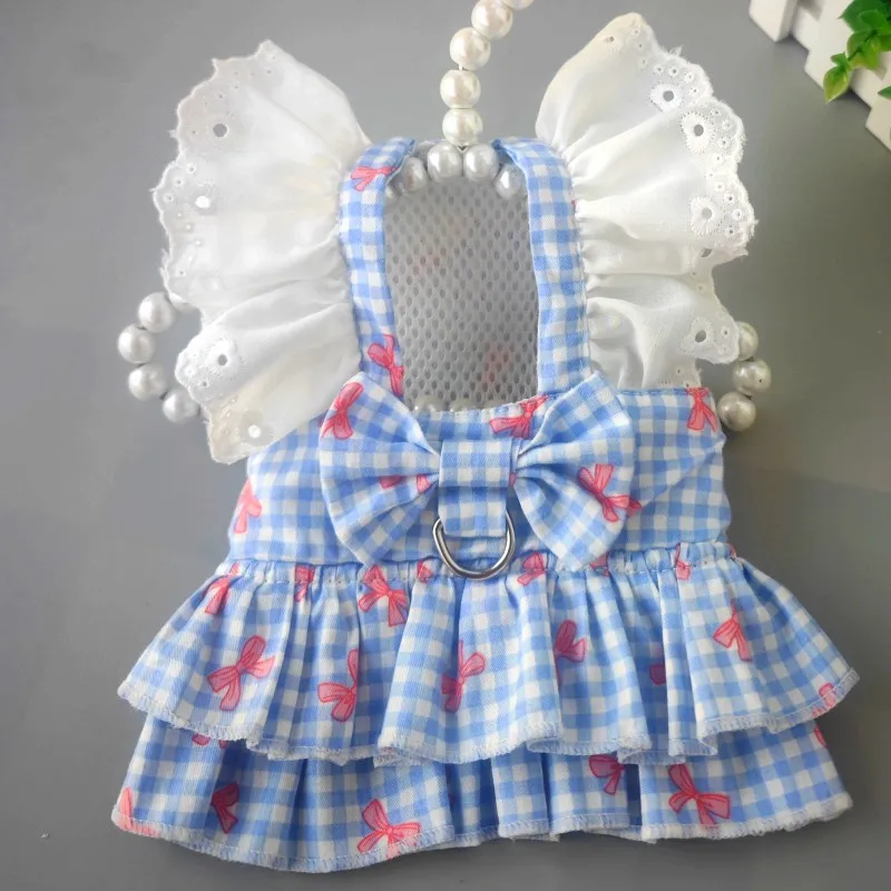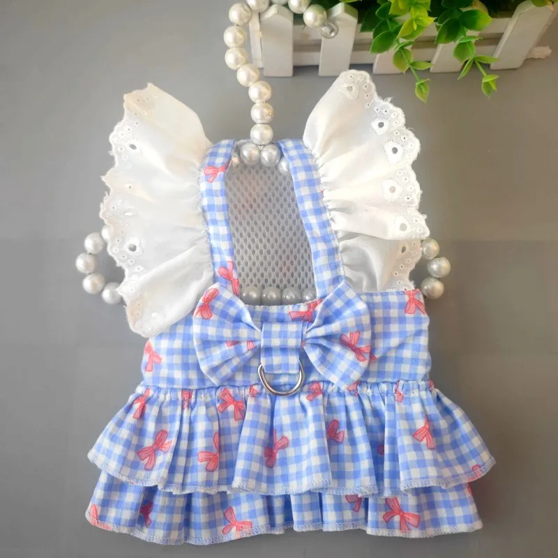 Vestido con lazo a cuadros para primavera/verano para mascotas, bonito vestido con mangas de peluche en el pecho y la espalda, vestidos para perros pequeños y cachorros
