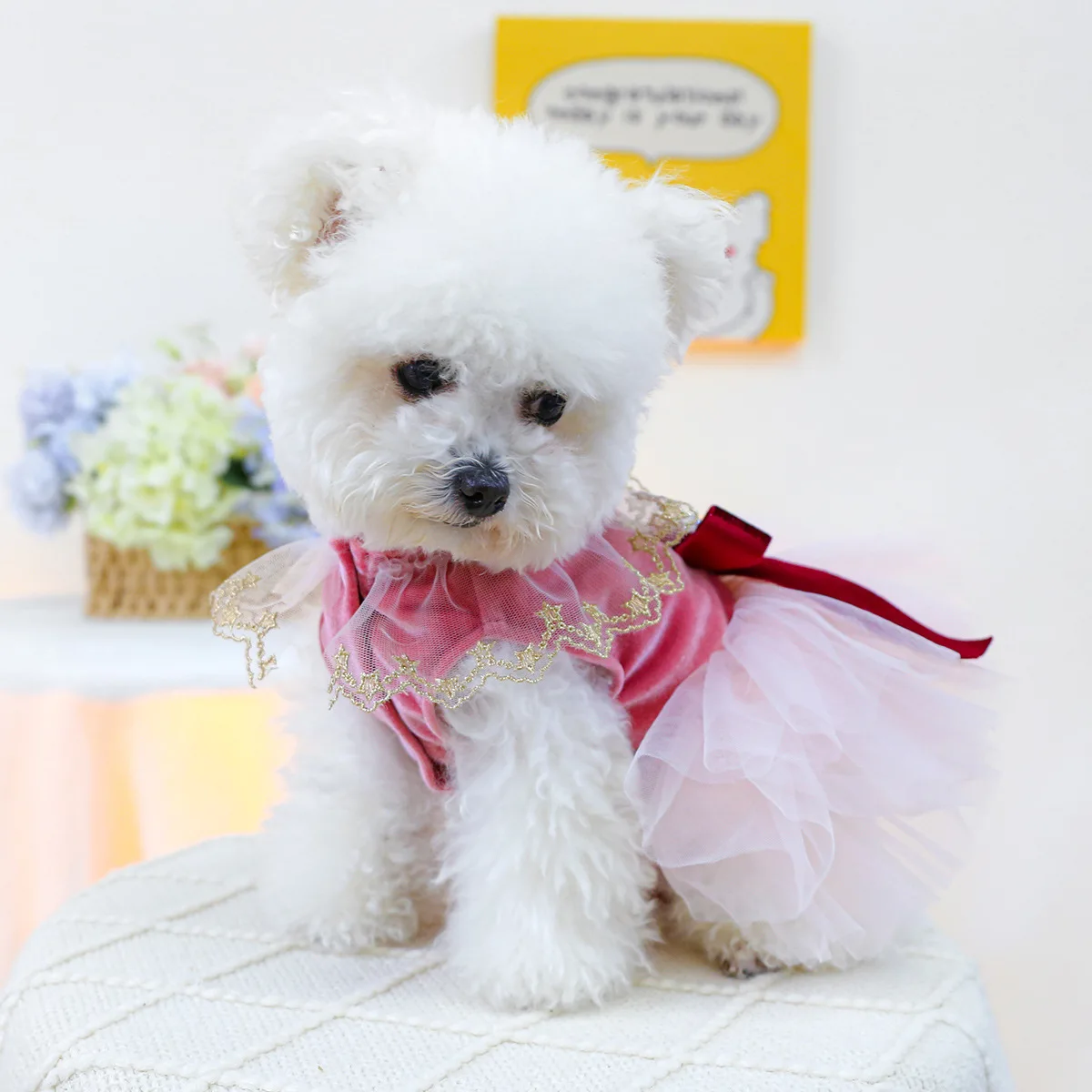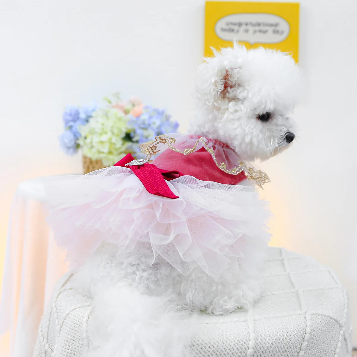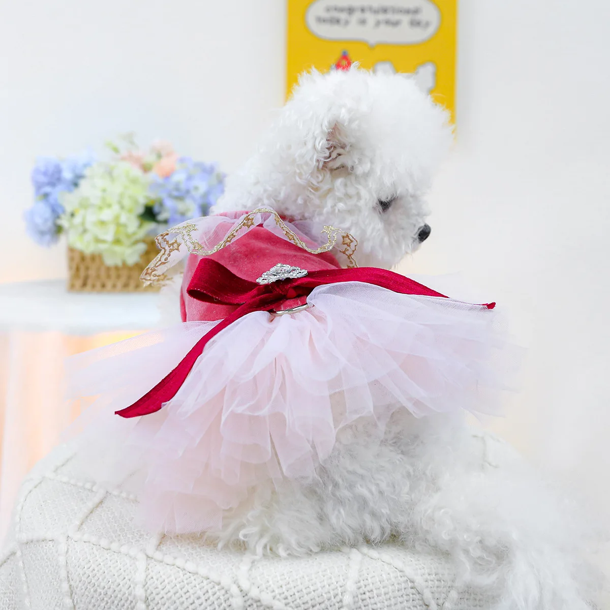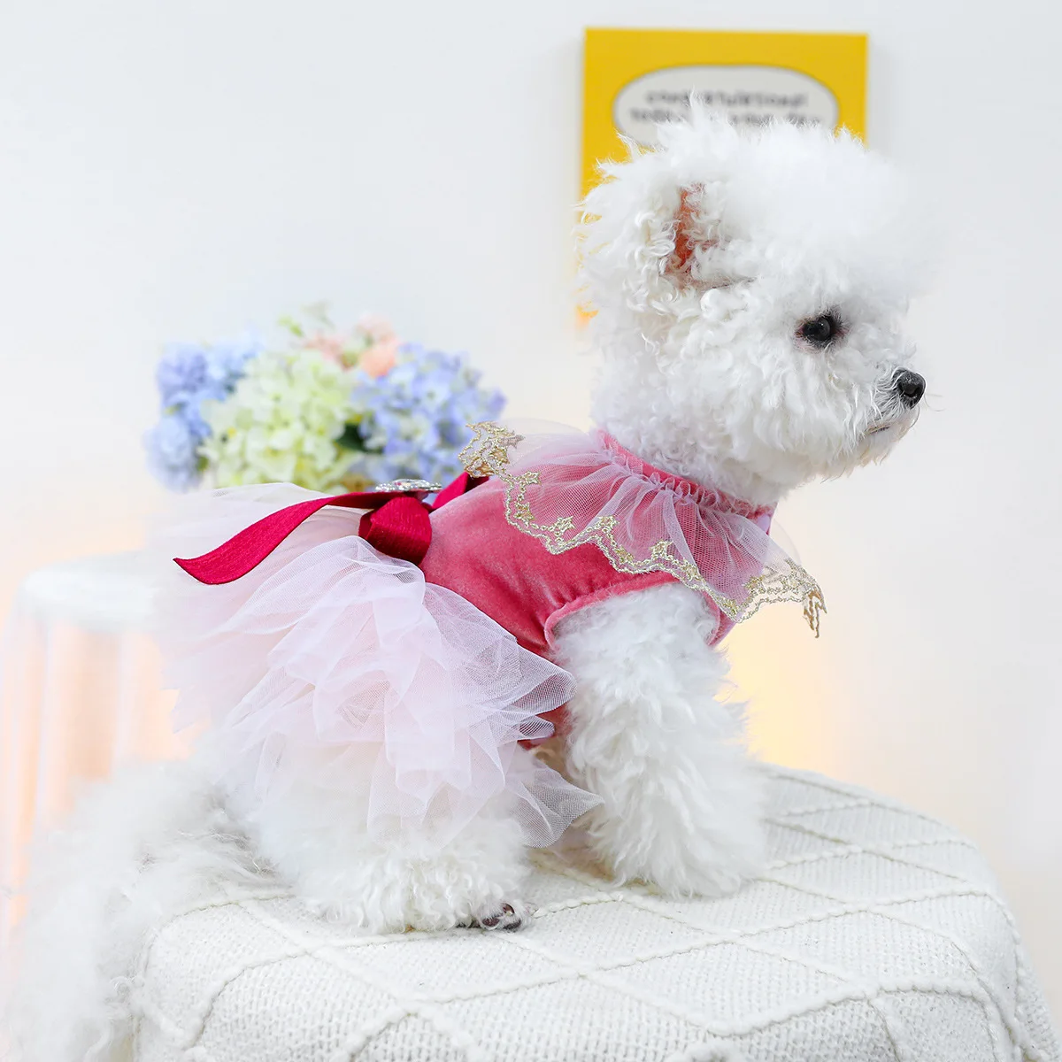 Vestido de malla de empalme de terciopelo para mascotas, abrigo con lazo para perros y gatos, vestido de hilo de princesa, vestidos de otoño/invierno para perros pequeños y cachorros