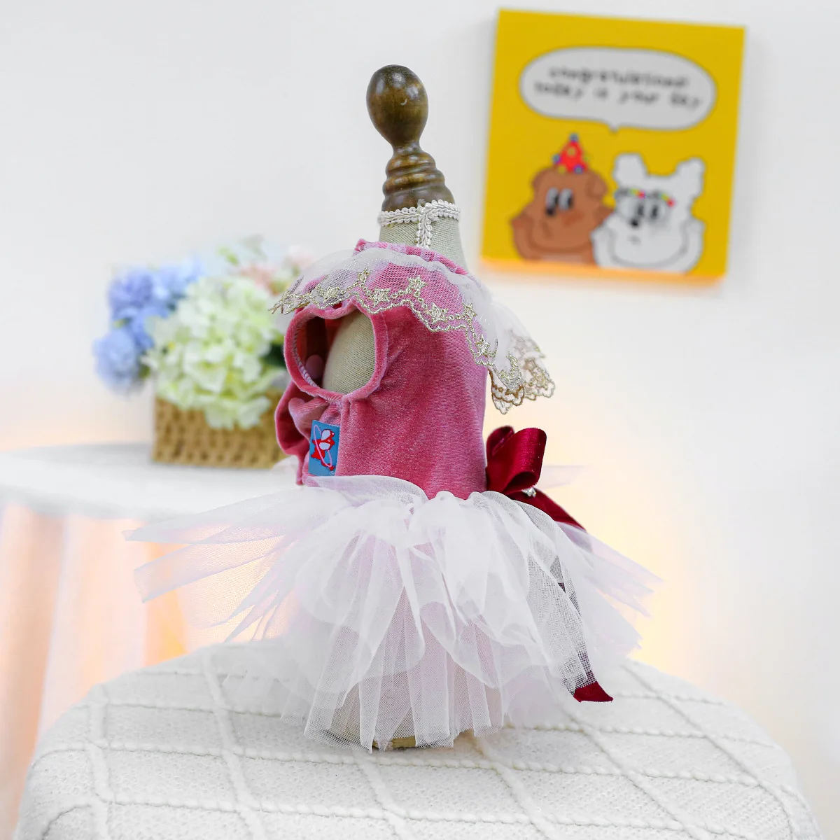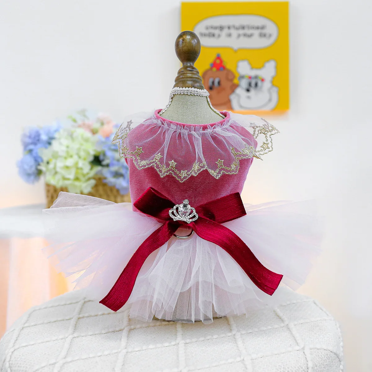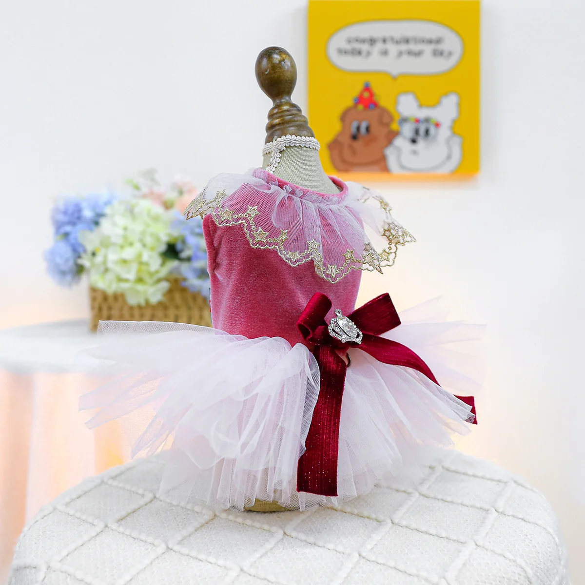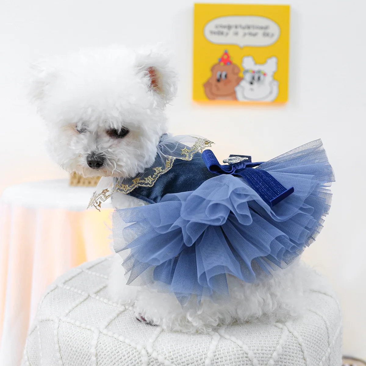 Vestido de malla de empalme de terciopelo para mascotas, abrigo con lazo para perros y gatos, vestido de hilo de princesa, vestidos de otoño/invierno para perros pequeños y cachorros