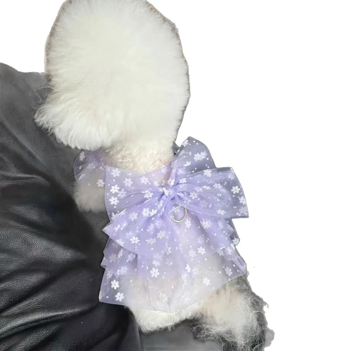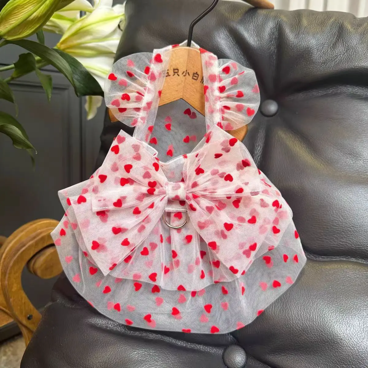 Vestido de malla con lazo de amor para mascotas, falda de princesa con mangas voladoras para gatos, chaleco protector solar, Top de peluche, ropa para cachorros