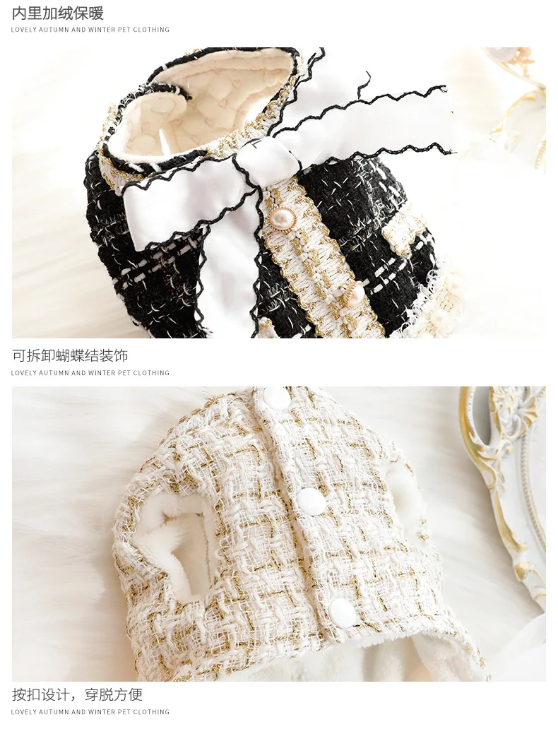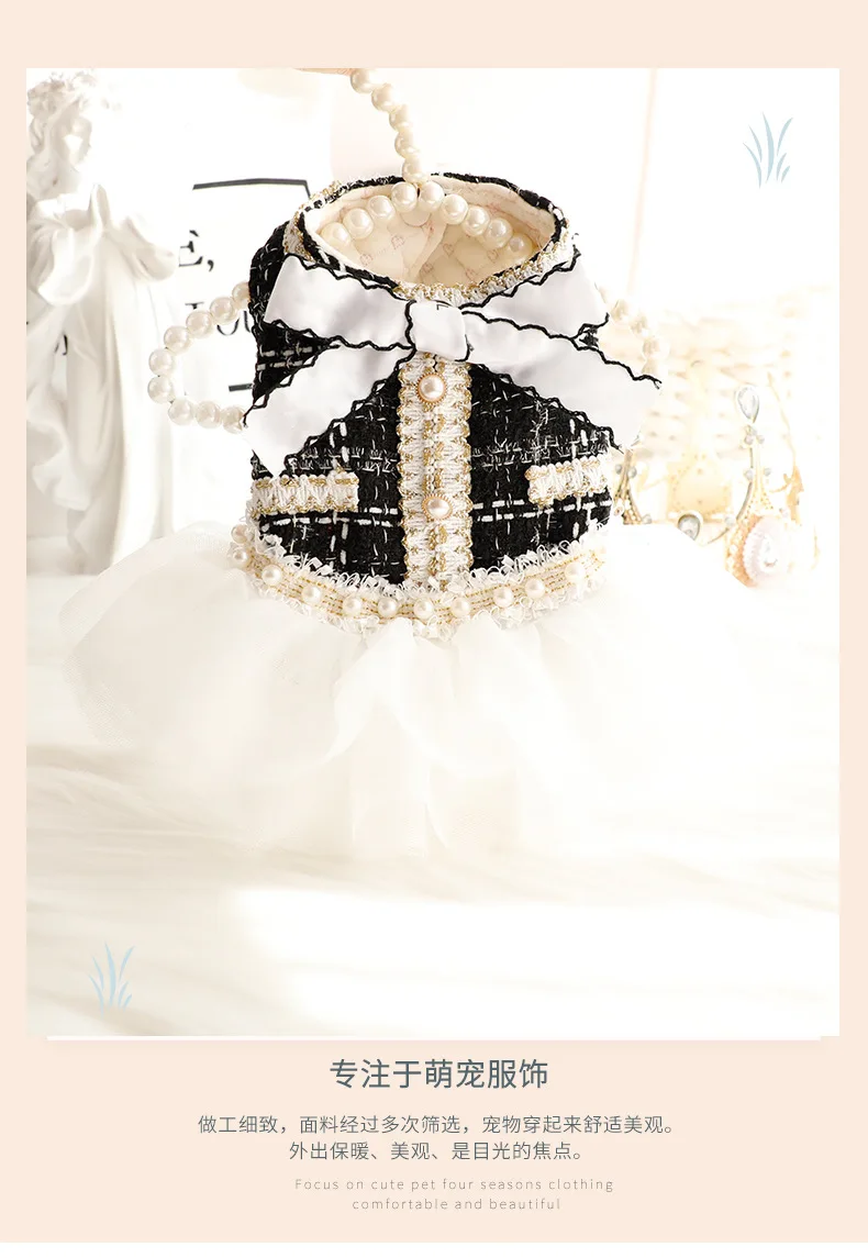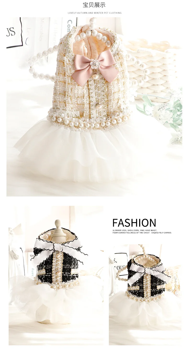 Vestido de malla de retazos de piel para mascotas, abrigo de suéter con lazo, falda esponjosa de princesa de gato, encaje de perlas, perro pequeño, oso de peluche para mascotas, Otoño e Invierno