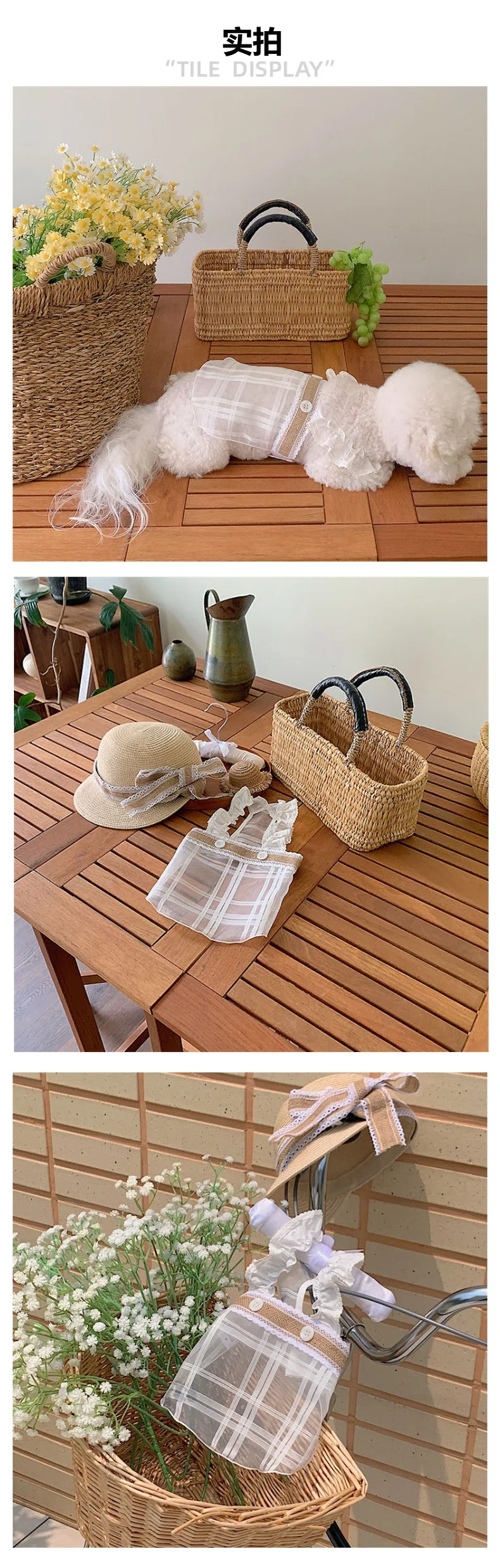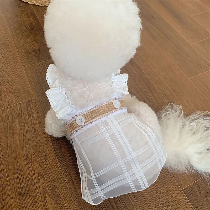 Vestido de malla transparente de primavera para mascotas, chaleco plisado a cuadros con tirantes para el hombro, ropa para perros pequeños