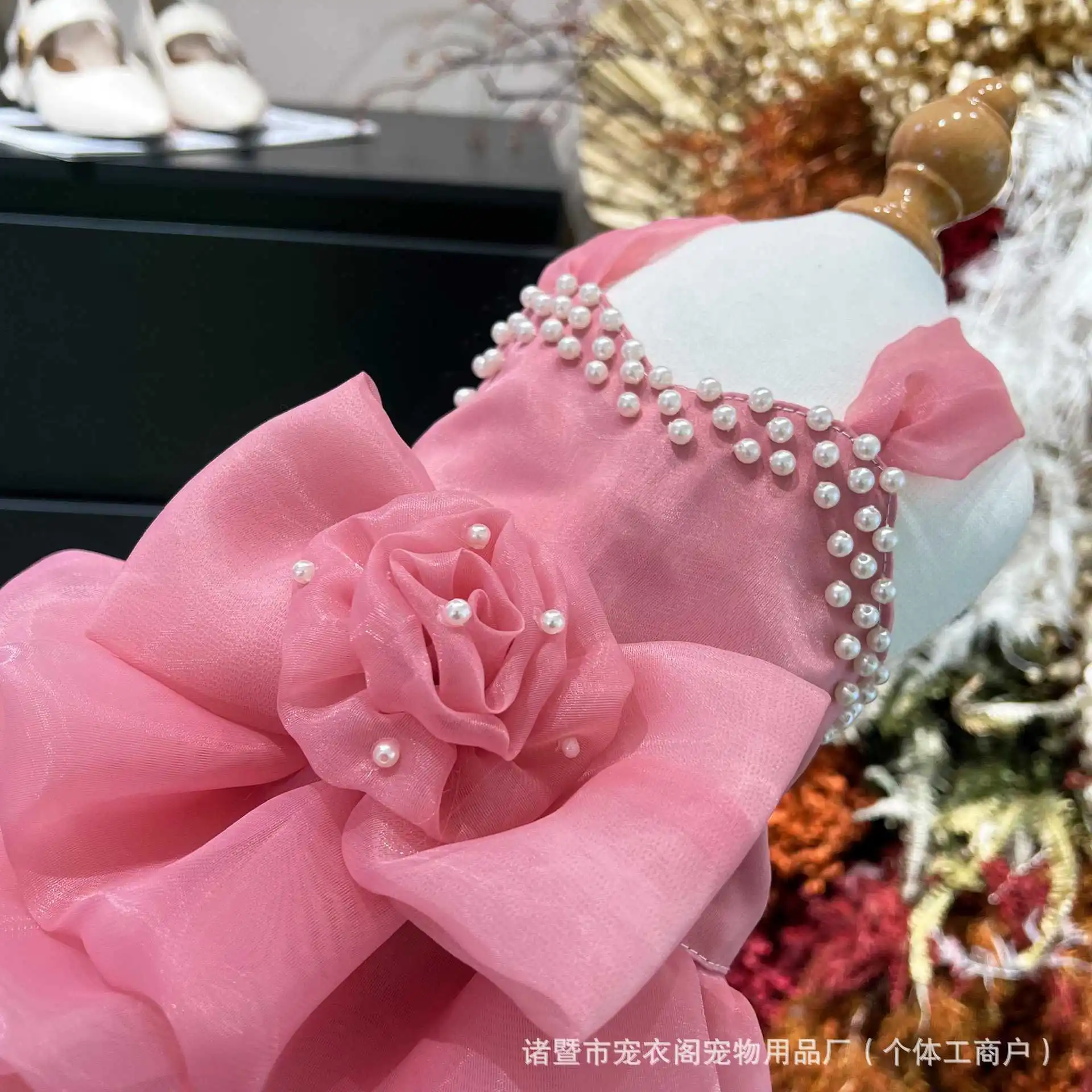Vestido de novia hecho a mano para mascotas, vestido Formal con adornos de perlas rosas florales para cachorros, vestido de fiesta nupcial de Bulldog Francés Teddy Bichon