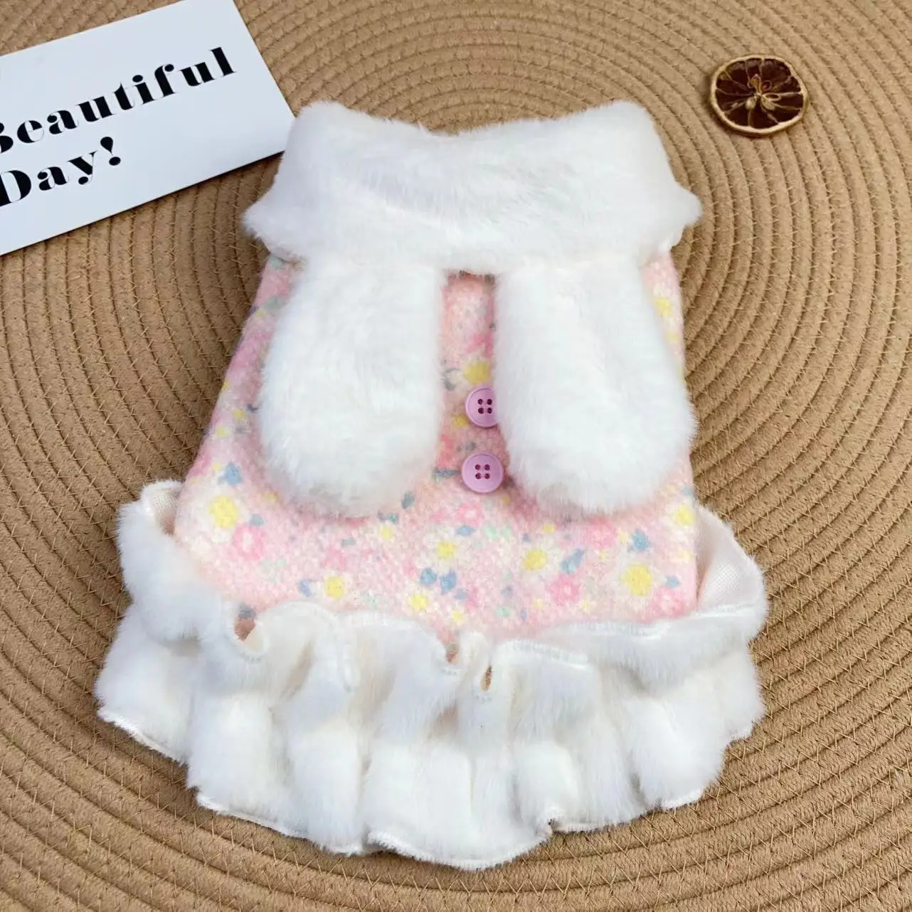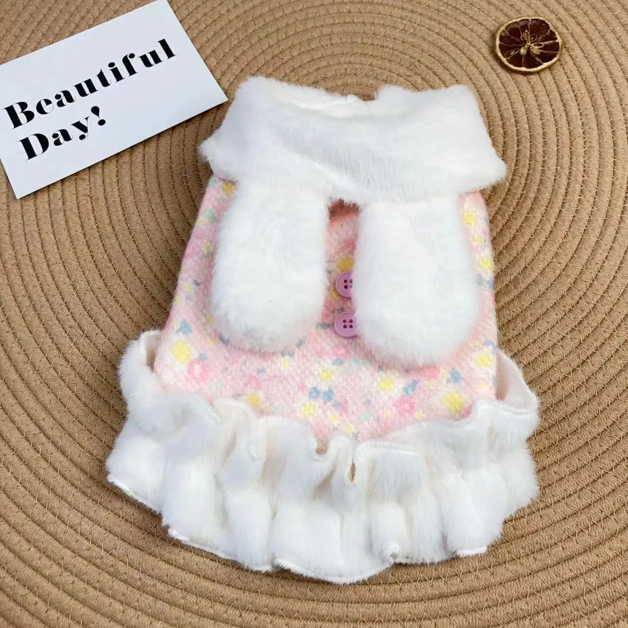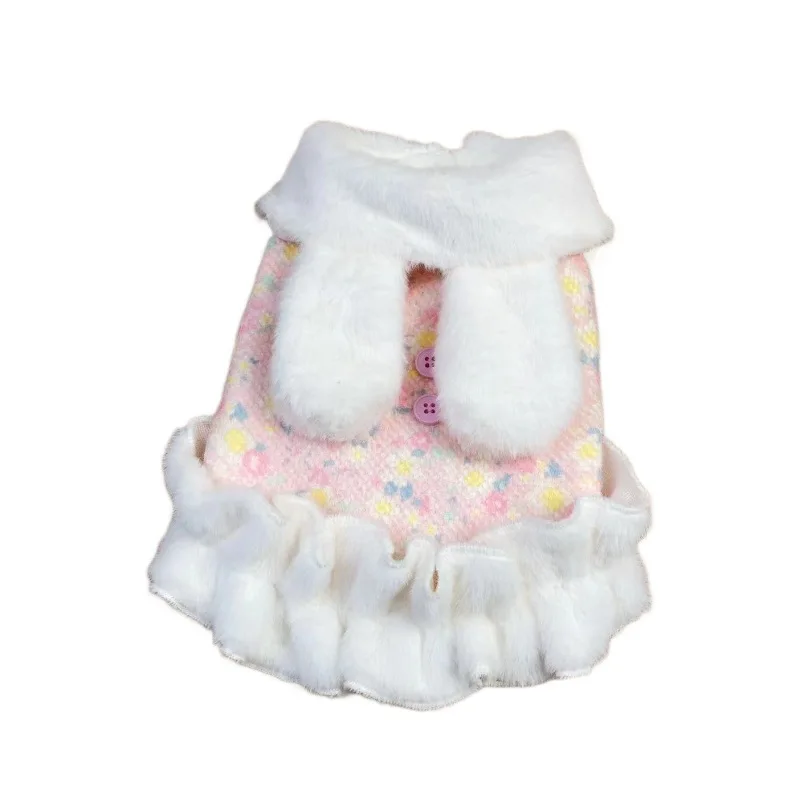 Es lo suficientemente grueso como para sentirse cálido. Las orejas de conejo son muy lindas. Como no tiene mangas, parece fácil moverse con él y mi perro regresó de un paseo feliz. La talla S le queda perfectamente a mi chihuahua con una circunferencia de pecho de 34 cm, una altura de 25 cm y un peso de 2.5 kg.